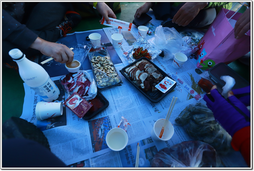 ▼ 1시간 가량 주어진 배 갑판에서 준비한 음식을 먹으며 막걸리 파티가 벌어지고...