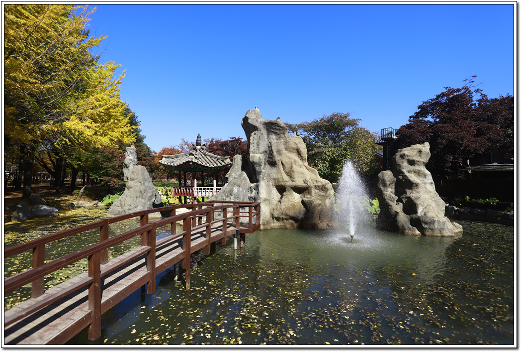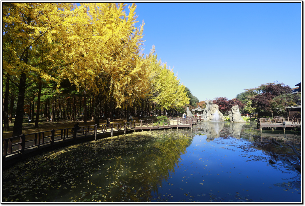 ▼ 은행나무와 어우러진 연못이 파란 하늘과 대비되면서 아름다운 풍경에 잠시 몰입하게 된다.