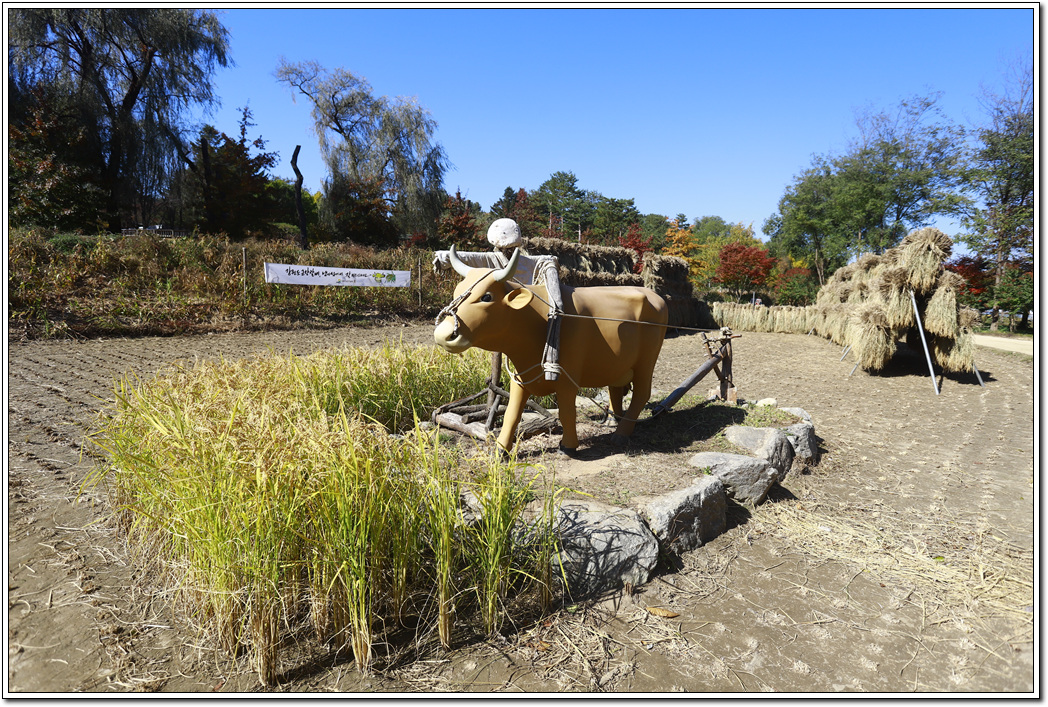 ▼ 섬 한편에는 이와 같이 쟁기질하는 모습의 소와 수확을 한 볏 낫가리가 있어 농촌의 정취를 흠뻑 느끼게 하고 어린 시절의 고향을 떠 올리게 한다.