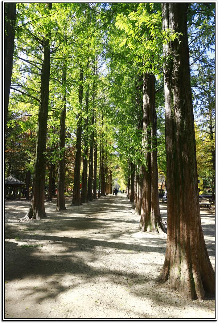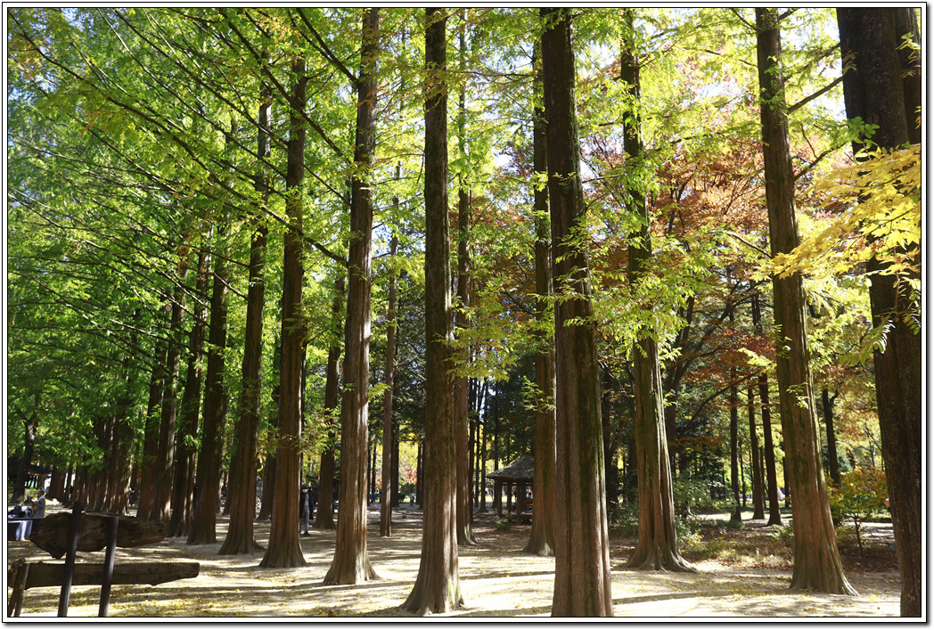 ▼ 이번에는 메타세콰이어나무 길을 걸어 담아봤다. 이 나무는 얼핏 보면 상록수 같지만 낙엽수여서 서리가 내리면 모두 떨어지게 되는데 조금은 늦게 단풍이 드는 듯 마는 듯 낙엽이 지고 만다. 곧게 높이 자라는 나무의 특성상 웅장하여 깊은 산중에 와 있는 느낌을 주어 봄부터 운치가 있어 좋다.
