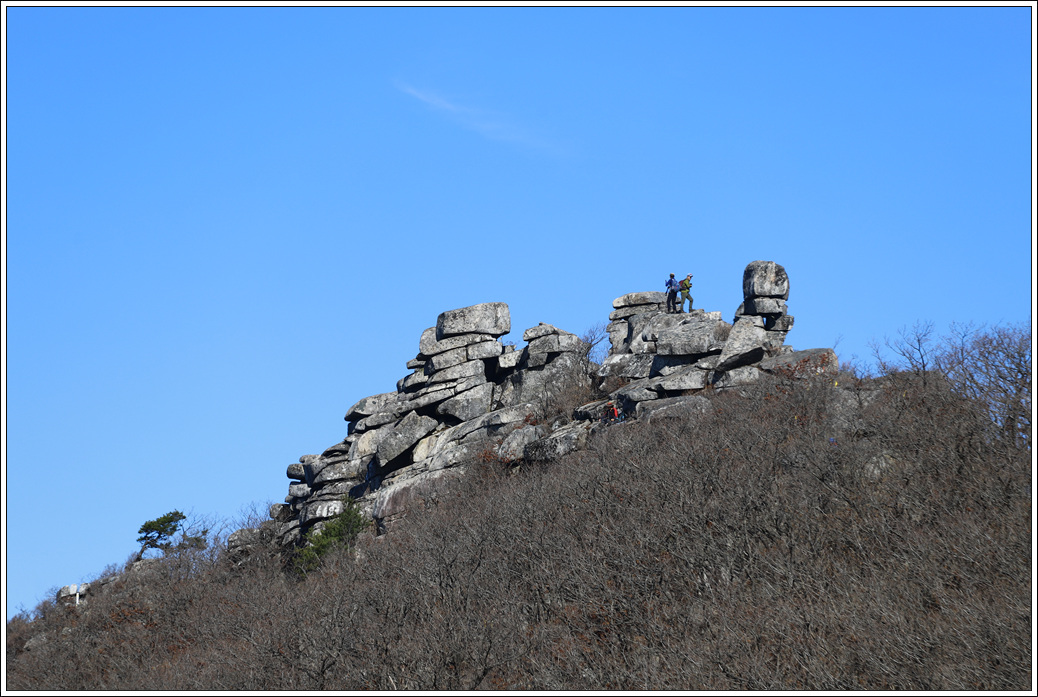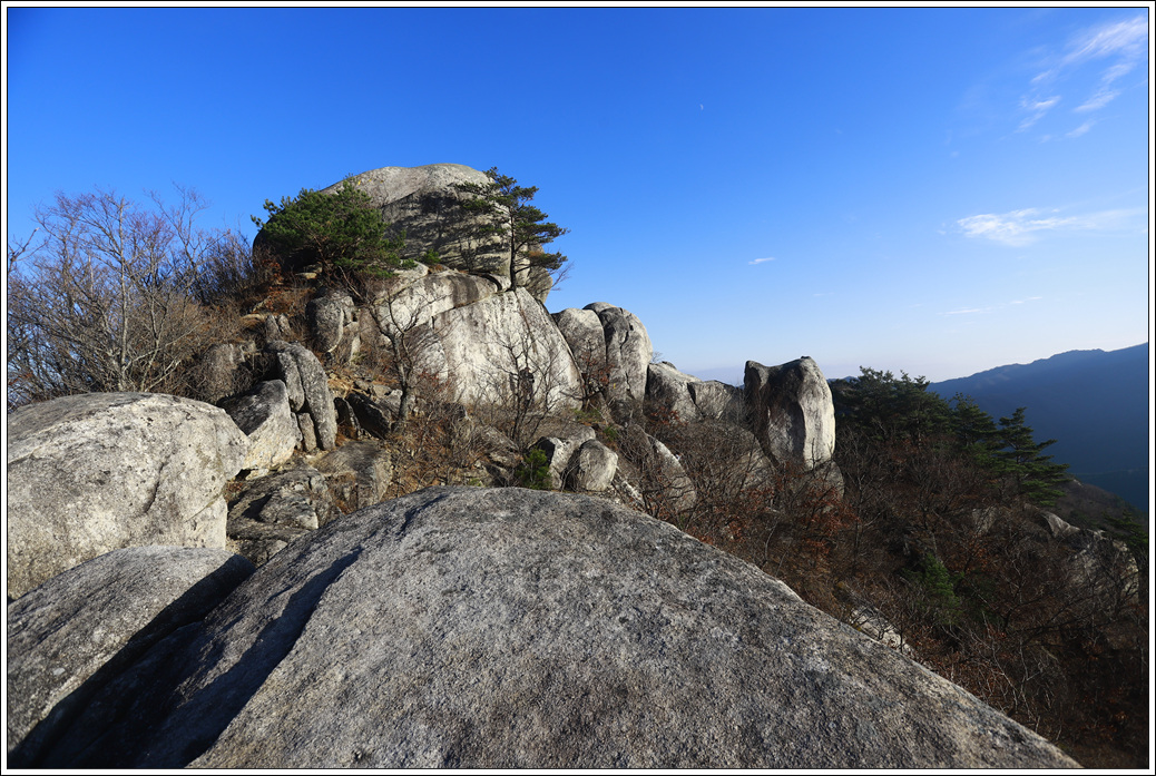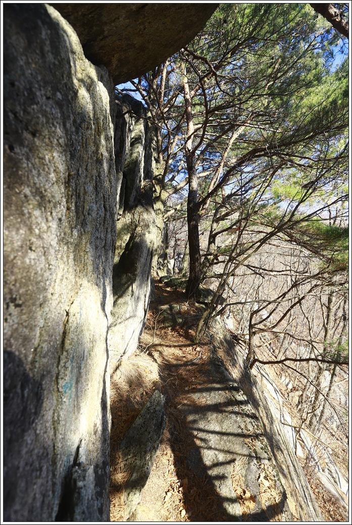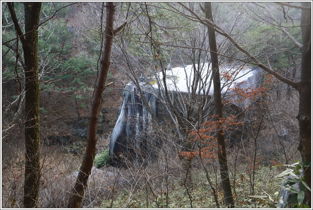 ▼ 가파르게 하산하는 등로도 만만치 않다. 거의 하산할 무렵 거대한 바위들이 눈길을 끈다.