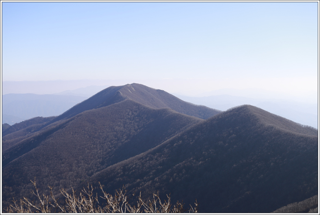 ▼ 동봉에서 뒤돌아 본 기백산으로 부터 이어진 능선