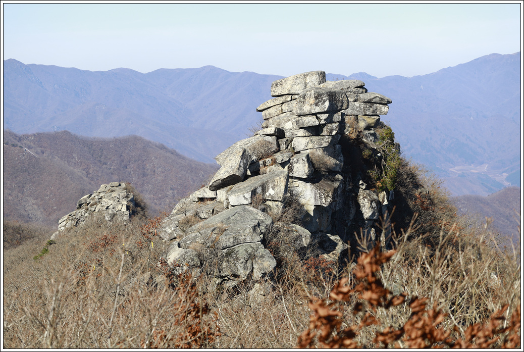 ▼ 기백산에서 금원산으로 이어지는 능선상에 무더기 같이 쌓인 바위군