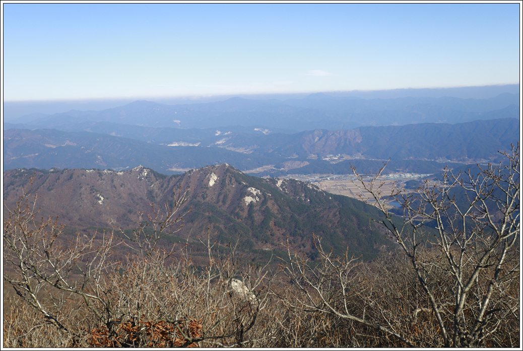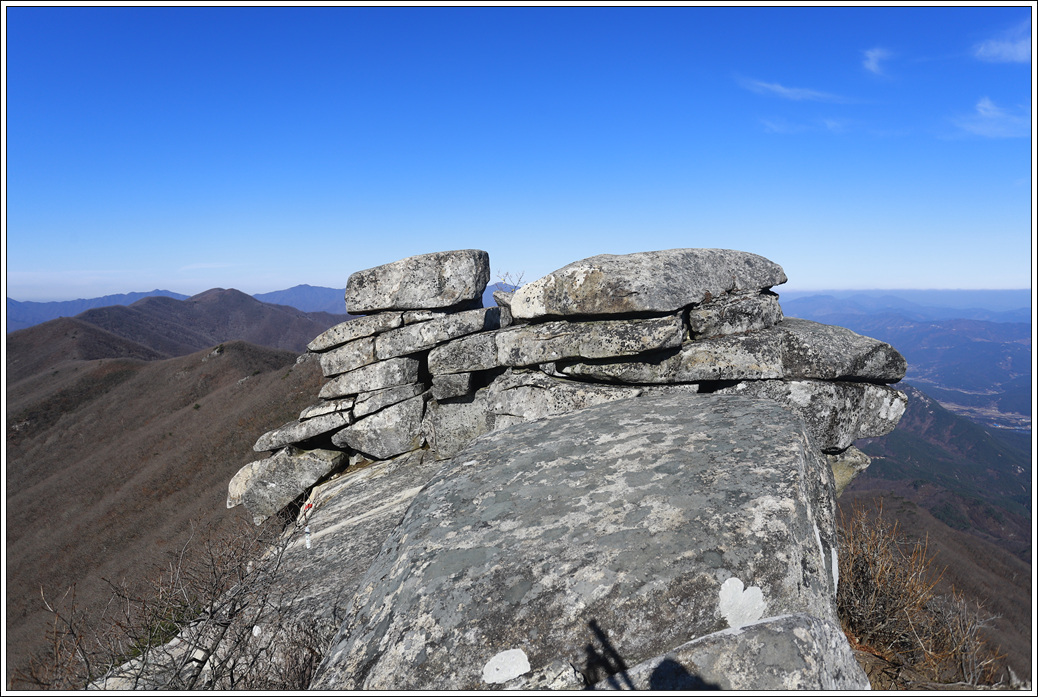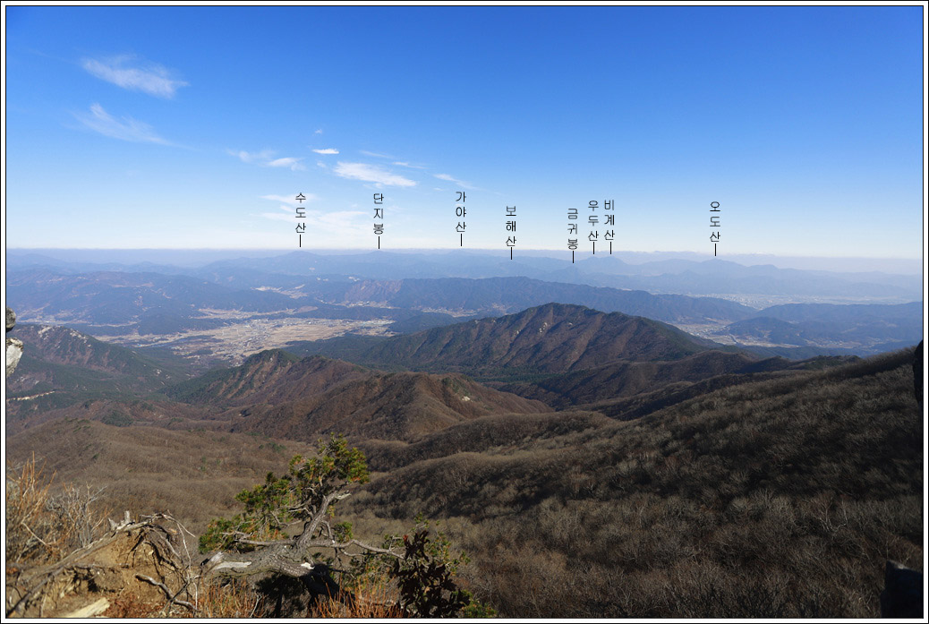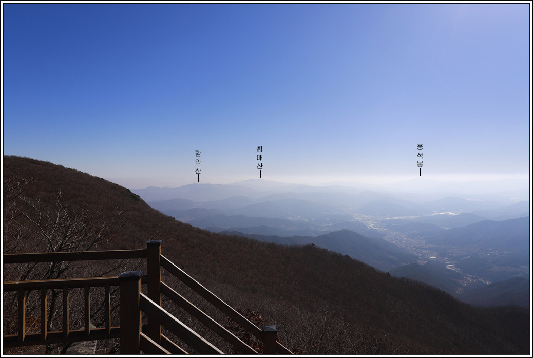 ▼ 숨이 턱에 닿아 정상이겠거니 올라왔는데 웬걸... 그냥 전망대다. 정상이 아니더라도 좋다. 남쪽으로는 햇살이 퍼져 약간의 가스층이 있긴하지만 너무도 조망이 좋아 남쪽으로 부터 북쪽 방향으로 주변 산세를 살펴 본다. 멀리 황매산이 보이고 지리산 자락인 웅석봉도 어렴풋이 보인다.