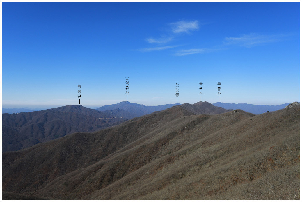 ▼ 북쪽 방향을 바라보니 월봉산에서 덕유산으로 뻗은 능선이 한눈에 들어온다. 월봉산은 못 올라 봤지만 남덕유산은 삿갓재로 두번, 덕유산은 올해 원추리 산행을 위해 무룡산을 경유, 하산한 적이 있어 이곳에서 덕유산의 주능선을 멋지게 조망하게 될 줄은 몰랐다. 오늘의 산행지인 금원산까지의 능선도 그리 멀지 않게 보인다.