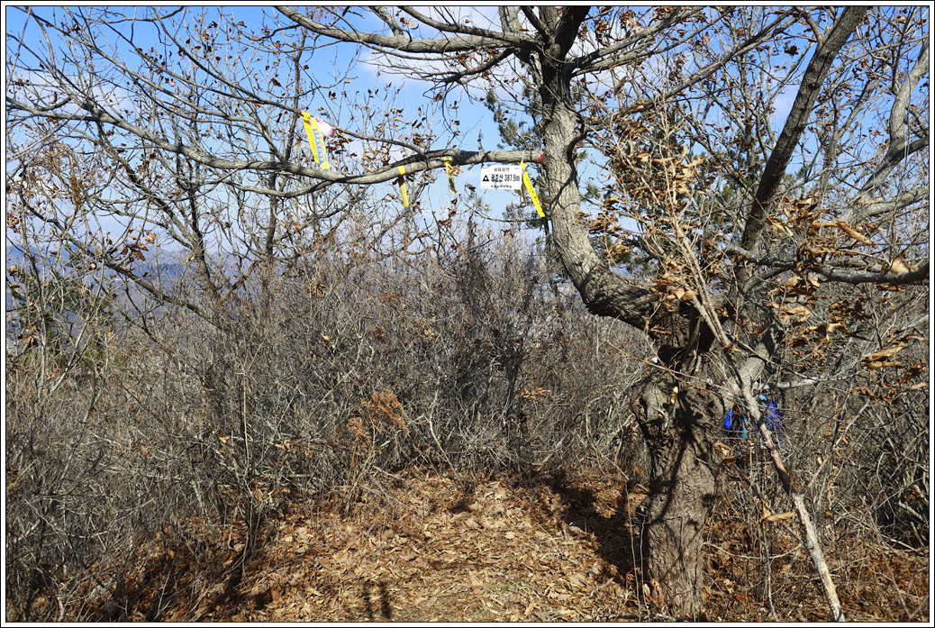 ▼ 들머리에서 1.6km 지점을 30여분만에 오른 광춘산...정상석은 없고 개인이 나뭇가지에 걸어 놓은 표지가 정상임을 말해준다. 조망도 없고 산 이름이 있다는 자체가 무색하리 만큼 초라한 정상(387.9m)이다.