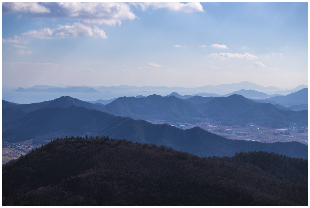 ▼ 조망은 최고로서, 북동쪽으로 장흥군 안양면의 평야위로 철쭉으로 유명한 제암산, 사자산, 일림산이 한눈에 들어 오는데 특히 사자산의 머리와 꼬리가 웅장하게 다가온다.
