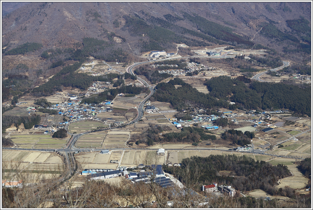 ▼ 사자우봉 아래의 안양면 기산리와 비동리 마을로 윗쪽에 원광대통합의료병원도 위치해 있다.