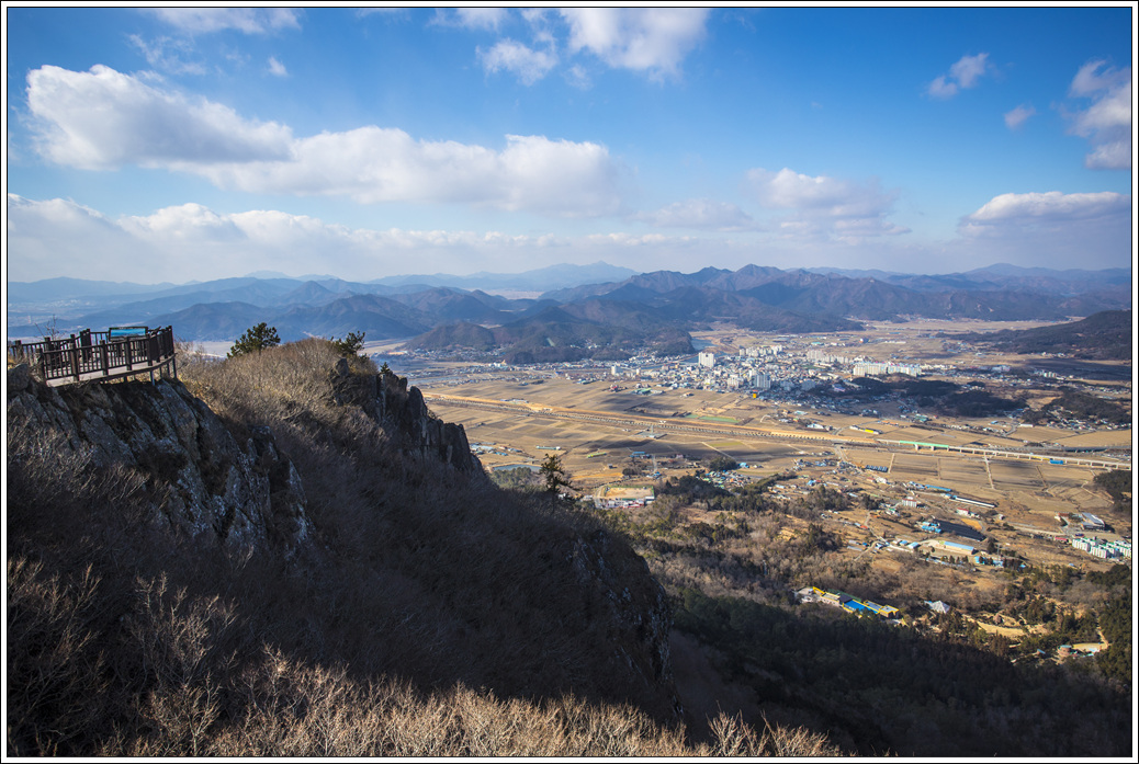 ▼ 억불산 정상으로 남쪽 방향은 바위가 전혀 없어 보이는 산이지만 북쪽 방향은 절벽으로 형성되어 있다. 아래 흰 건물이 천문과학관으로 이곳부터 본격적인 억불산을 오르게 될 것이다.