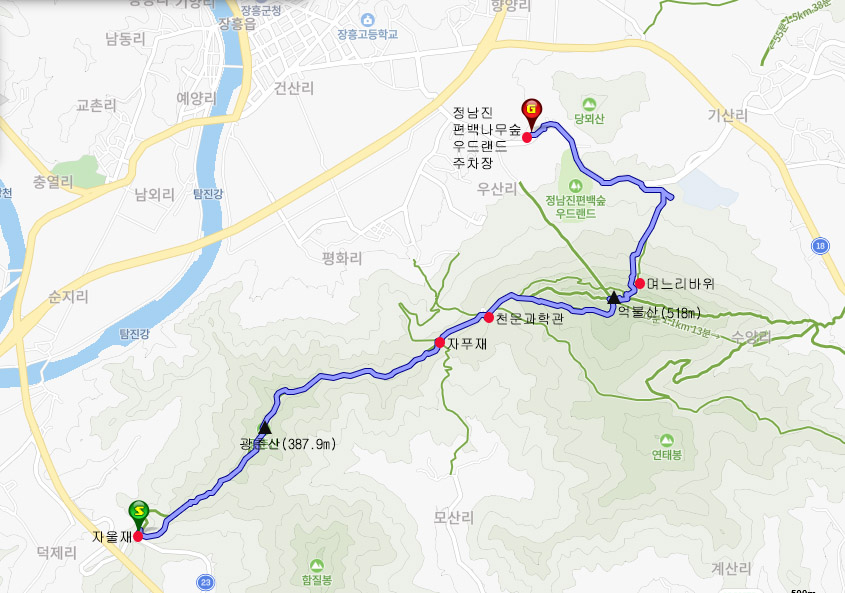 ♣ 소재지: 들머리-전남 장흥군 장흥읍 덕제리 자울재, 정상-전남 장흥군 안양면 기산리 산 90-11, 날머리-전남 장흥군 장흥읍 우산리 9