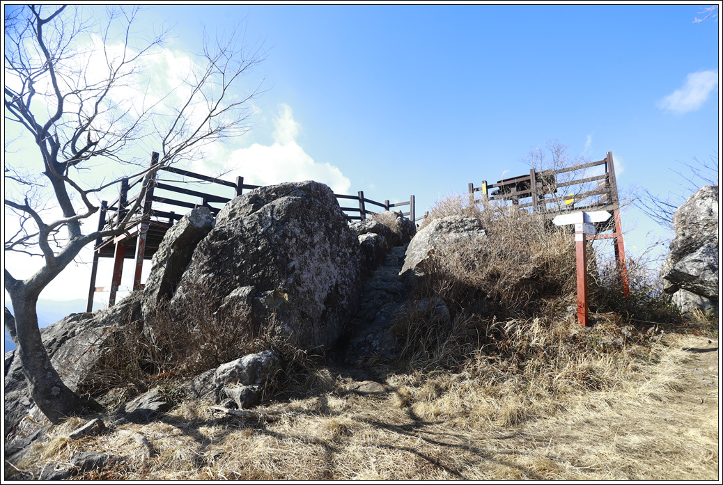 ▼ 데크 반대편의 억불산 정상석...억불산은 천관산, 제암산, 사자산과 함께 '장흥군의 4대명산'으로 불린다. 정상부의 기암괴석들이 솟아 있는 모양이 모두 부처가 서있는 것(억개의 불상:億佛) 같아 지명이 유래되었다고 전한다.