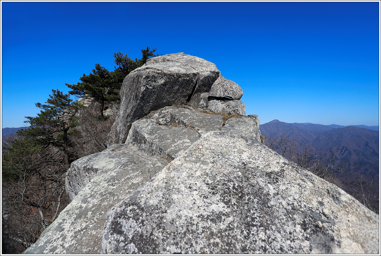 ▼ 이런 칼날암봉 능선에 안전로프가 없어 안전에 신경쓰지 않을 수가 없다.