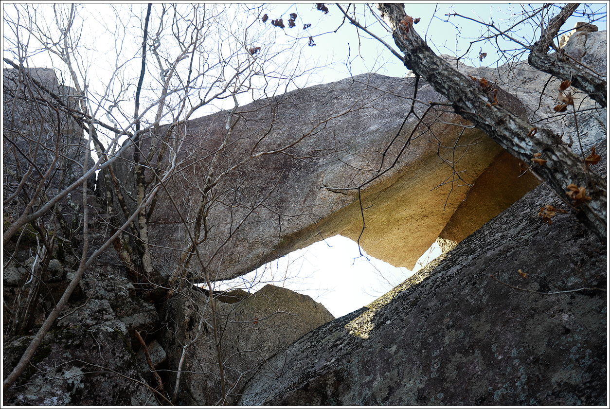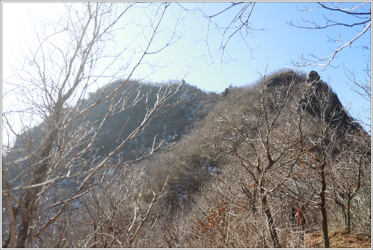 ▼ 나뭇가지 사이로 보이는 진행방향의 암릉이 오늘의 산행도 순탄하지 않을 것 같다는 느낌이다.