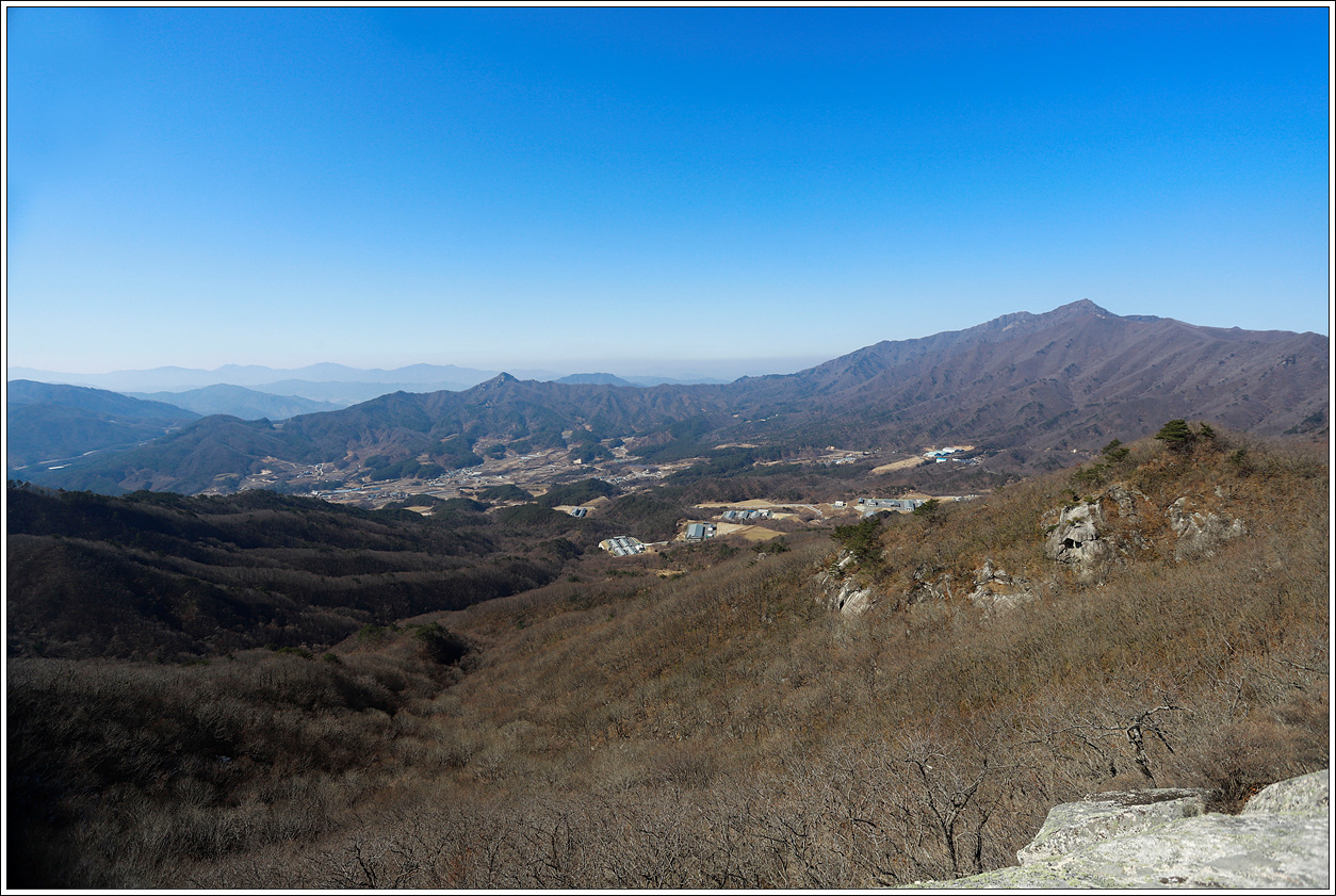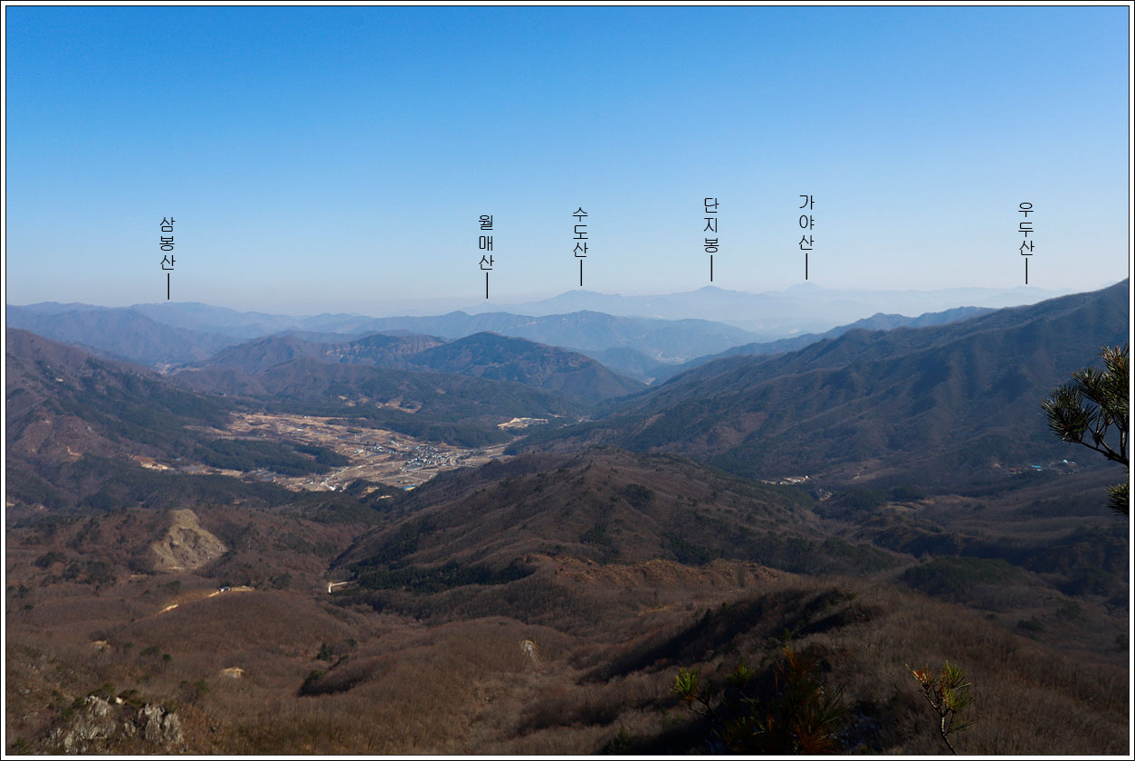 ▼ 북동 방향으로 월성마을과 가운데 멀리 수도산과 오른쪽 단지봉, 그 뒤로 오른쪽 합천의 가야산이 흐릿하나마 조망된다.