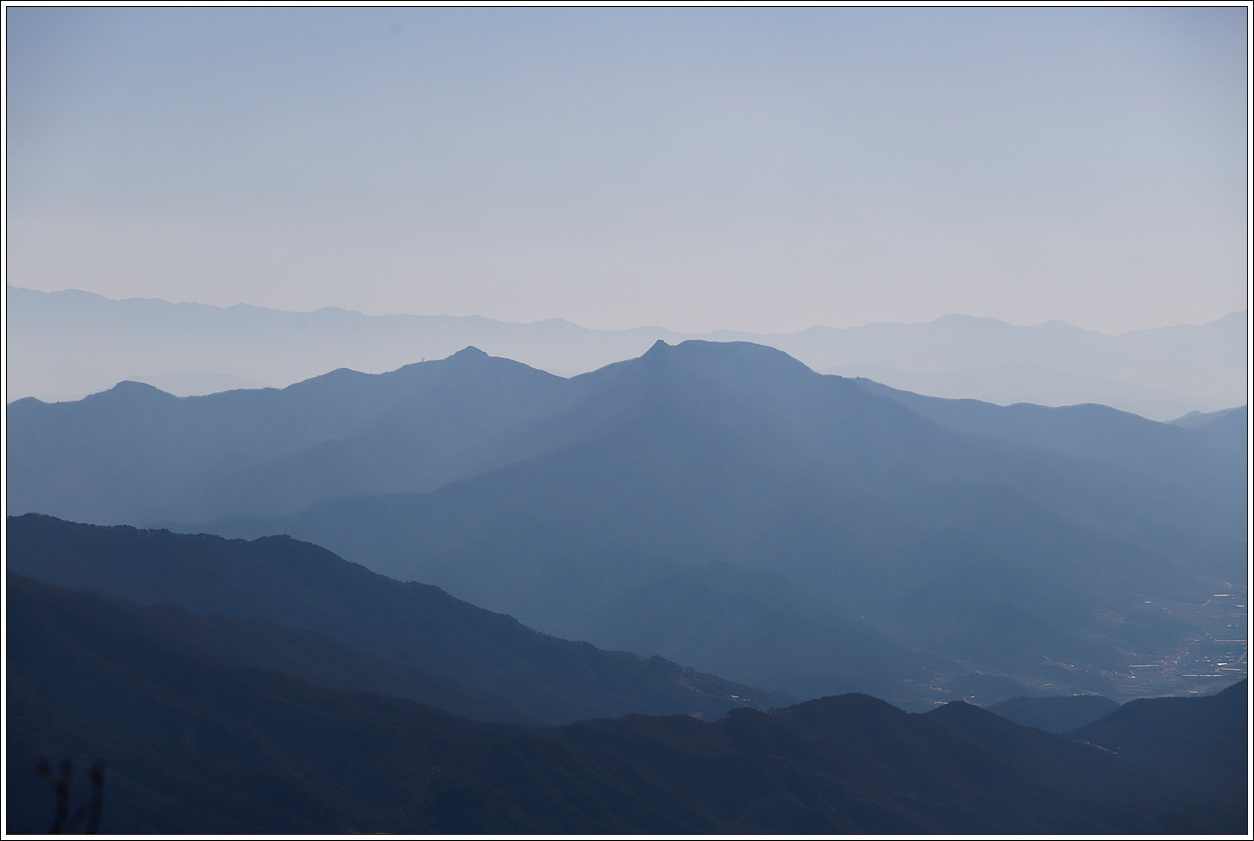 ▼ 멀리 지리산 주능선을 배경으로 앞에 대봉산(大鳳山) 왼쪽의 뾰족한 봉우리가 천왕봉(天王,1,228m), 오른쪽 뾰족한 봉우리가 닭벼슬 같아서 계관봉(鷄冠峰, 1,251m)이라 불리웠다는데...