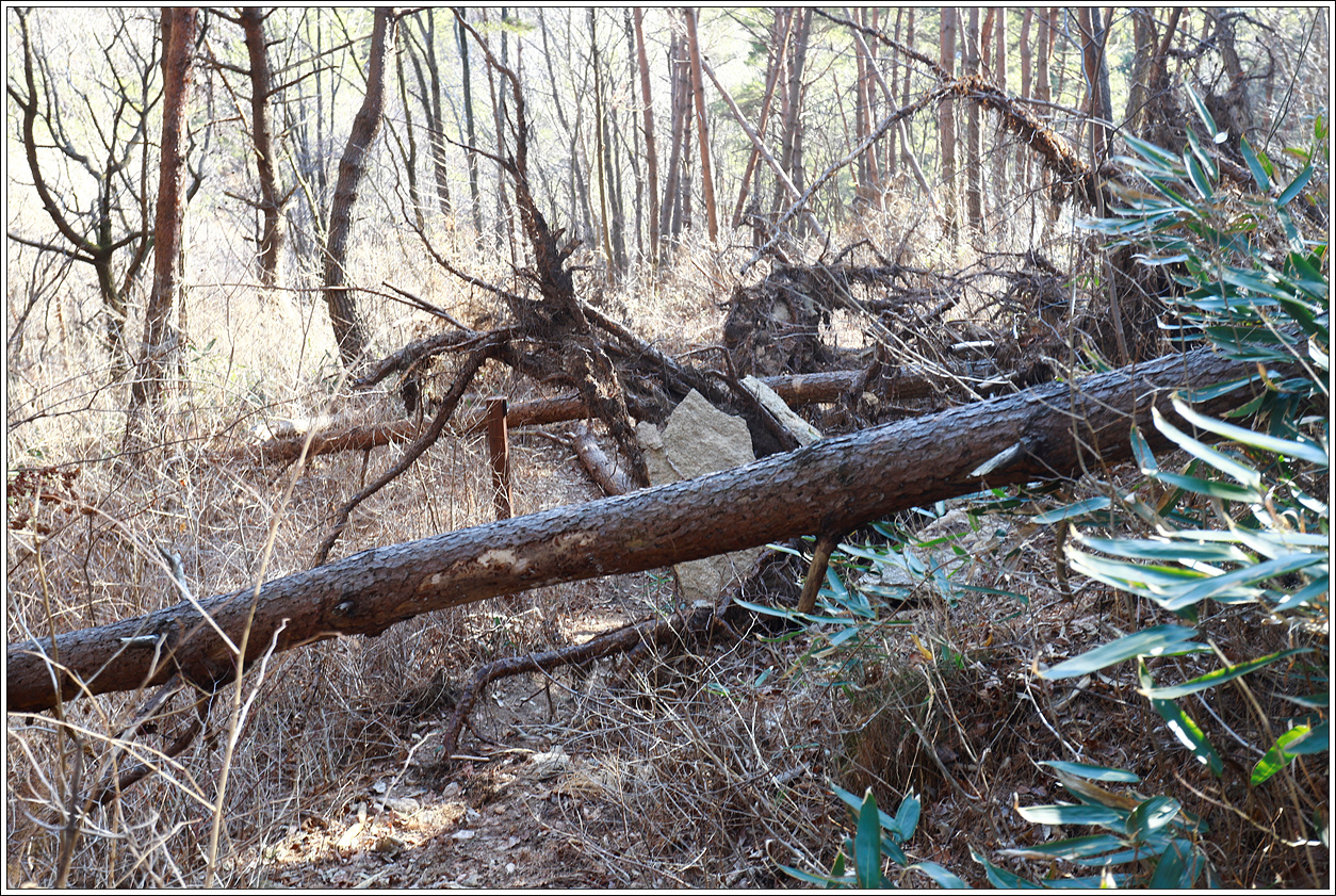 ▼ 칼날봉을 우회하여 올라서서 잠시 우틀하여 봉우리 정상을 보려했으나 소나무에 가려 보이질 않고 더 이상 진행하기 어려운 상태여서 뒤돌아 다시 진행방향으로 이동한다.