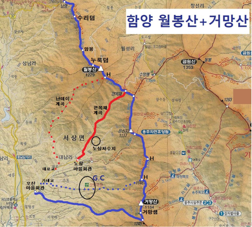 ♣ 산행코스: 남령재-수리덤(칼날봉)-누룩덤-월봉산-큰목재-계곡-노상저수지-노상마을회관