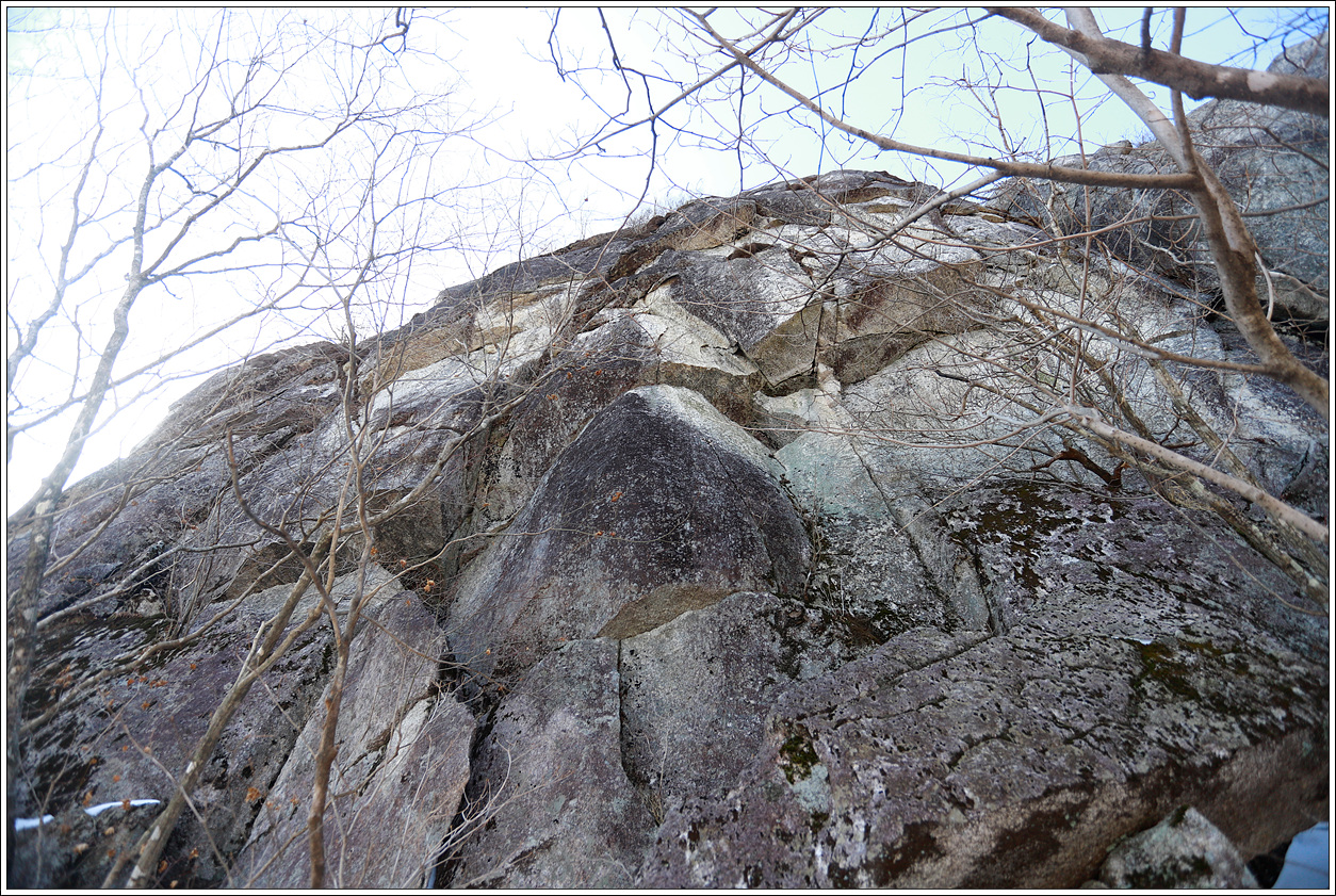 ▼ 직등하는 코스는 없을 듯 하고 암봉 왼쪽으로 우회하면서 윗쪽을 쳐다보니 정상 부근은 보이지 않는다.