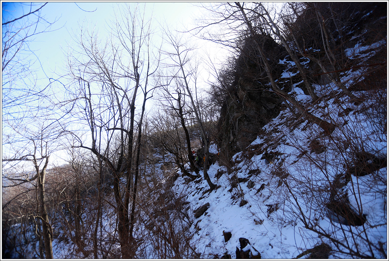 ▼ 가파른 내리막길, 사면에는 눈이 녹질 않아 빙판도 있어 아이젠을 하지 않으면 안될 상황이다. 몇 몇 인원이 아이젠을 휴대하지 않았는지, 착용하기 귀찮아서인지 그냥 용케도 넘어지지 않고 잘 걷는다. 몇 해전에 산행을 마치고 종료지점에서 아이젠을 벗고 몇 미터 가다가 넘어져 골절상을 입은 어느 회원이 생각 난다.
