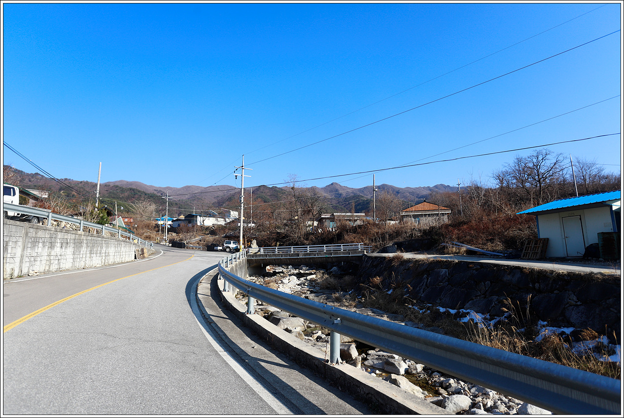 ▼ 날머리인 노상마을에 도착, 저 아래 산악회 버스가 기다린다.