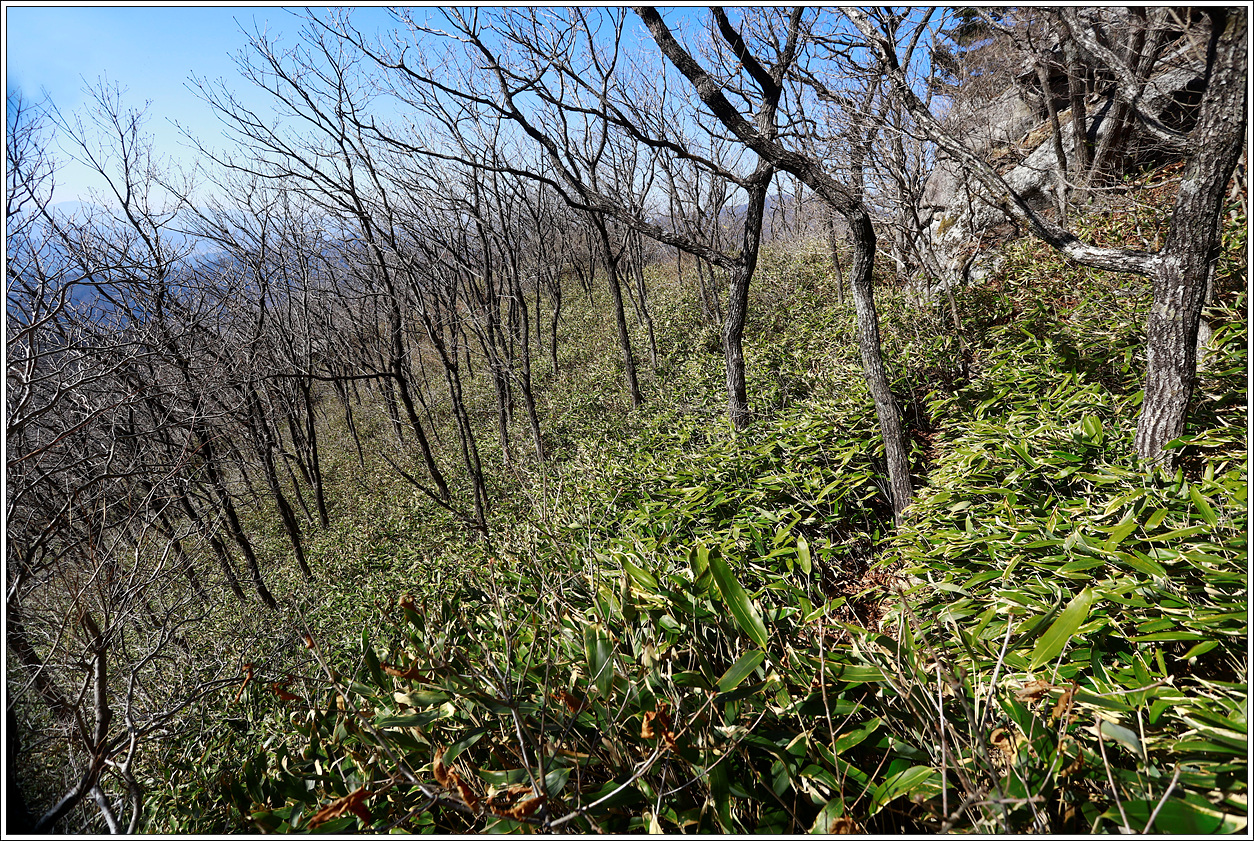 조릿대 사이의 등로는 눈이 녹으면서 얼음이 된 상태여서 보통 애를 먹은 것이 아니다.