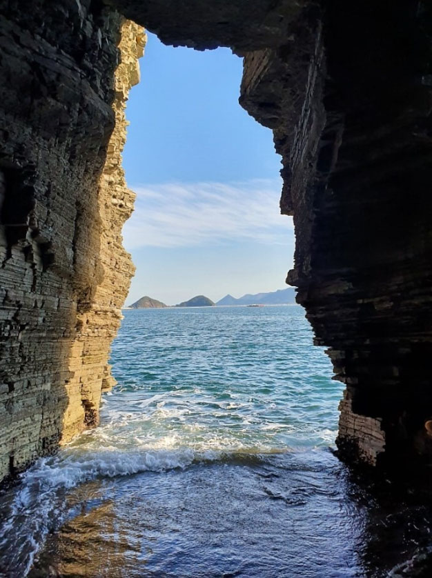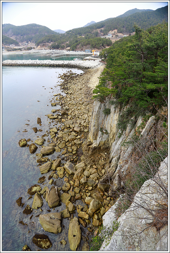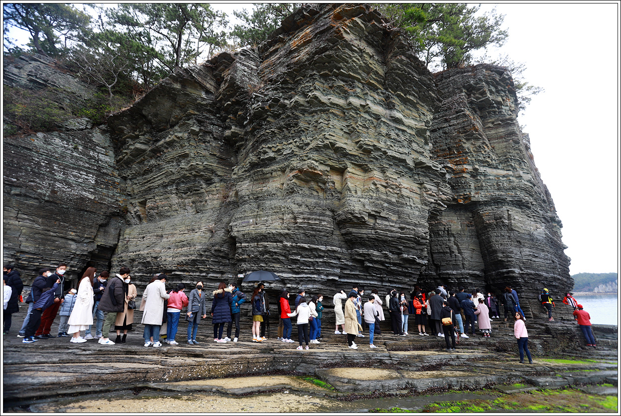 ▼ 해안절벽지대에 수만권의 책을 쌓아 놓은 듯한 기묘한 절벽과 동굴이 산재해 있어서 마치 변산반도의 채석강을 연상케 한다.
