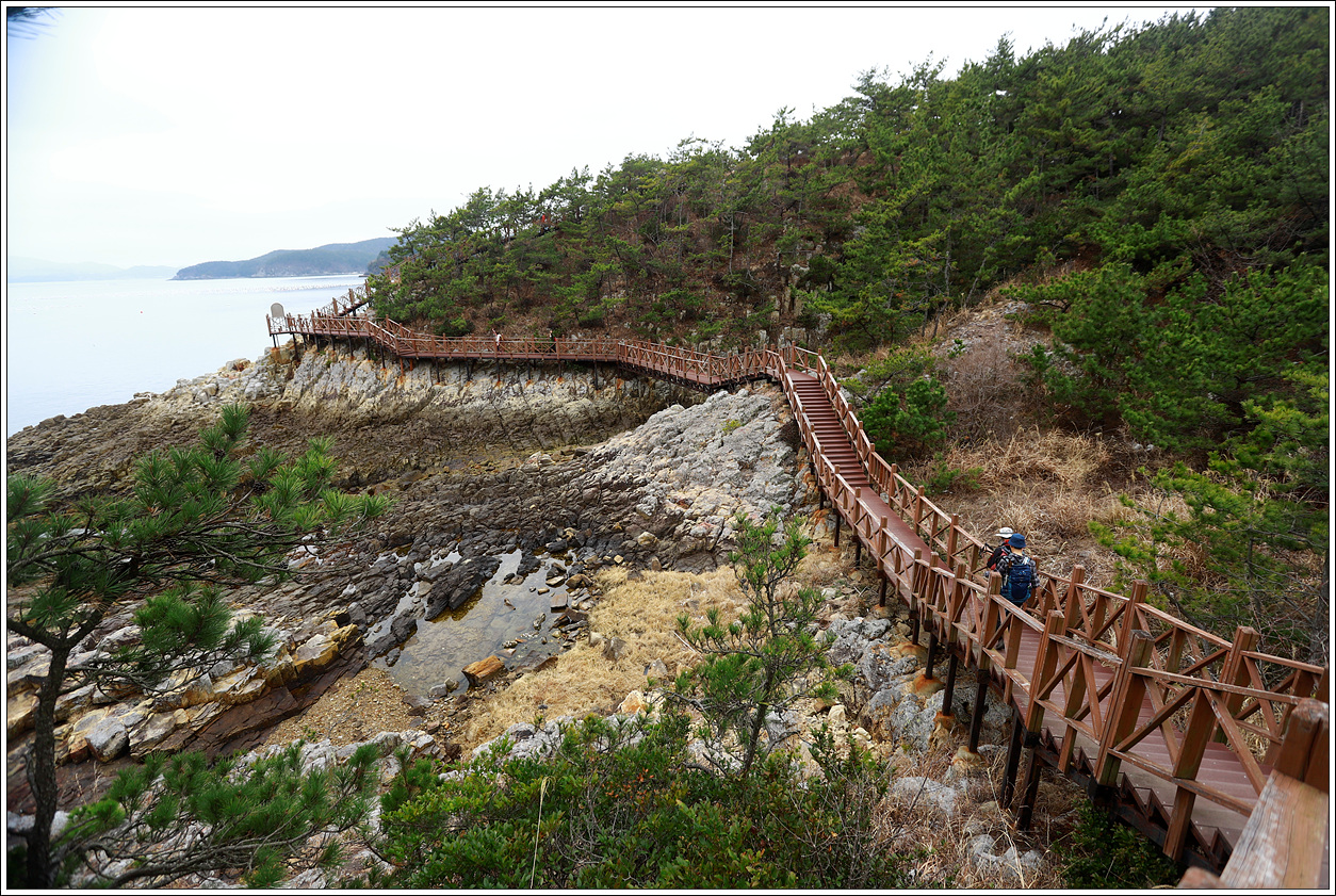 ▼ 앞에 보이는 경남청소년수련원을 경유, 상족암까지 이어지는 데크길이 해변을 끼고 운치가 있다.