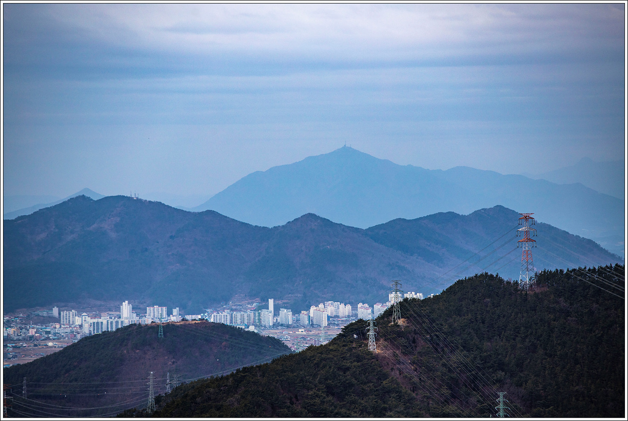 ▼ 삼천포의 각산 뒤로 금오산 정상의 통신탑까지 뚜렷이 보이는 날씨다.