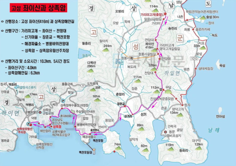 ▼ 상족암유람선주차장이 있는 덕명마을까지 16:30에 도착하면서 오늘 산행을 마친다. 좌이산을 올라 바라본 조망은 360도 탁 트여 주변의 낯익은 섬들과 산과 함께 근래 보기드문 풍경을 즐겼고 6년전 완전히 답사하지 못한 상족암을 둘러보게 되니 감회가 새롭다. 우리나라가 좁은 땅덩어리 같지만 가보고 가봐도 정말 가 볼 곳이 많다는 것을 다시 한번 느껴본 오늘이다.