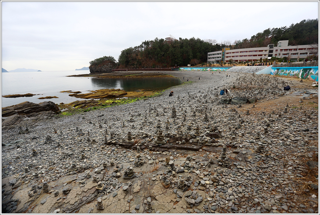 ▼ 청소년수련원 앞의 상족몽돌해수욕장에 도착, 수많은 작은 돌탑들이 마치 설악산 백담사앞 영실천에 쌓아 놓은 돌탑들을 연상케 한다. 나름, 모두의 소원이 이뤄지길... 빨리 코로나부터 물러나게 해달라고...
