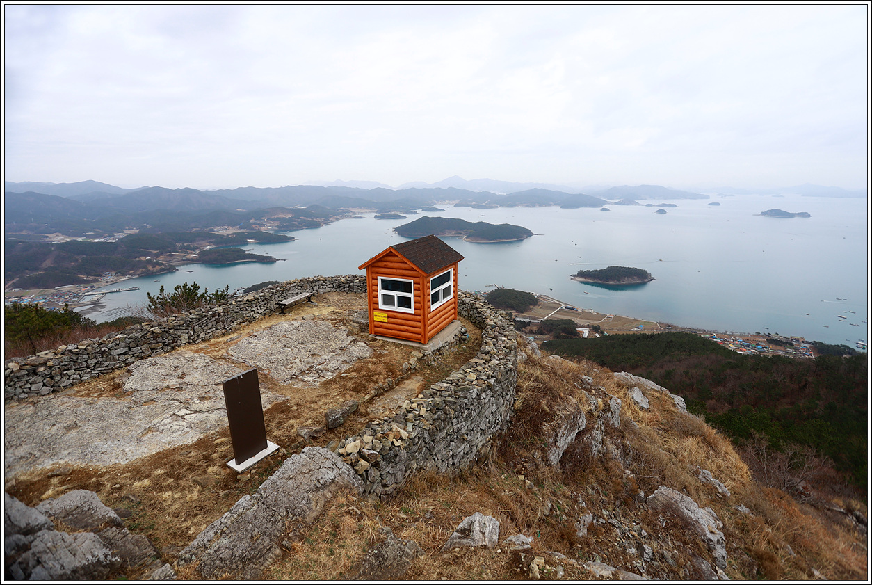 ▼ 알고보니 봉수대인데 좌이산 봉수대는 고성읍에서 약 30km 지점에 있고 거제 가라산 봉수대에서 온 신호를 전달하는 간봉(間烽)노선인데 산 아래에는 조선시대의 소을비포성(所乙非浦城)이 있다. 두 시설은 왜적을 막기 위해 함께 있었던 것으로 보인다. [안내문 인용]