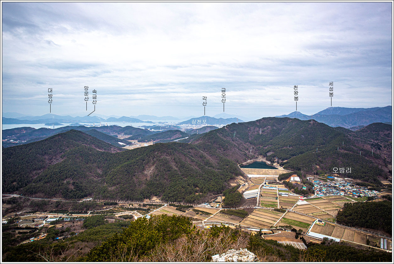 ▼ 살짝 오른쪽 남서방향으로 고개를 돌리면 멀리 남해의 금산이 보이고 군립공원인 호구산도 보이는 탁 트인 풍경이다.