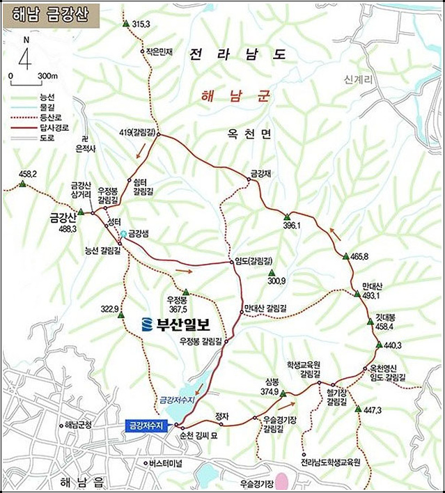 ♣ 산행코스: 해남농어촌공사-삼봉-매바위-헬기장-삼형제바위-깃대봉-만대산-금강재-삼거리-금강산-금강샘-금강저수지-주차장