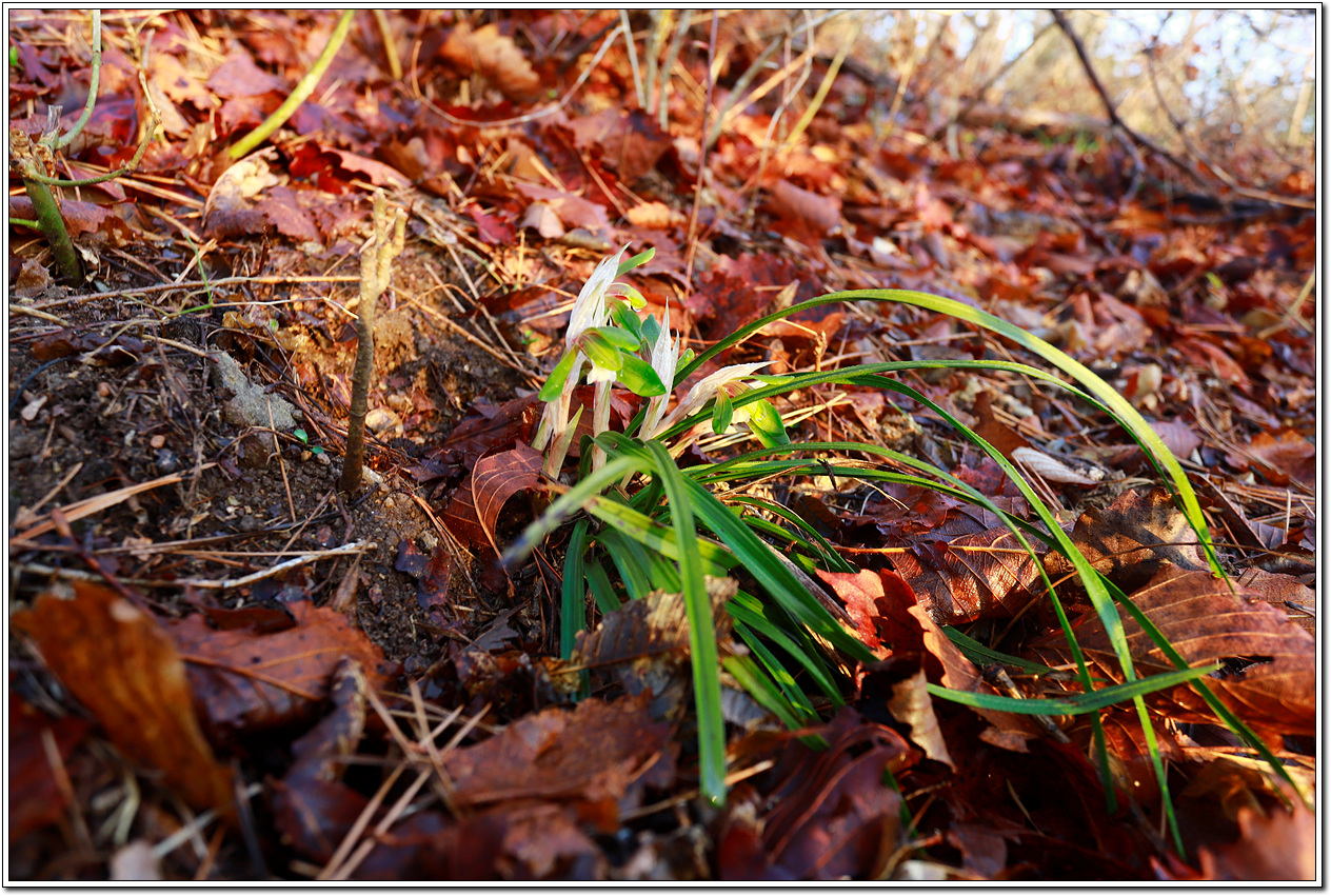 ▼ 등로 옆에 핀 보춘화(=춘란)가 벌써 피었다. 수십 년 전에는 흔히 볼 수 있는 야생화였지만 판매 목적으로 무단으로 채취해 가는 몰상식한 사람들로 인해 이젠 쉽게 눈에 띄지 않는 꽃으로 이렇게 아랫 지방에나 와야 간혹 볼 수 있게 됐다.