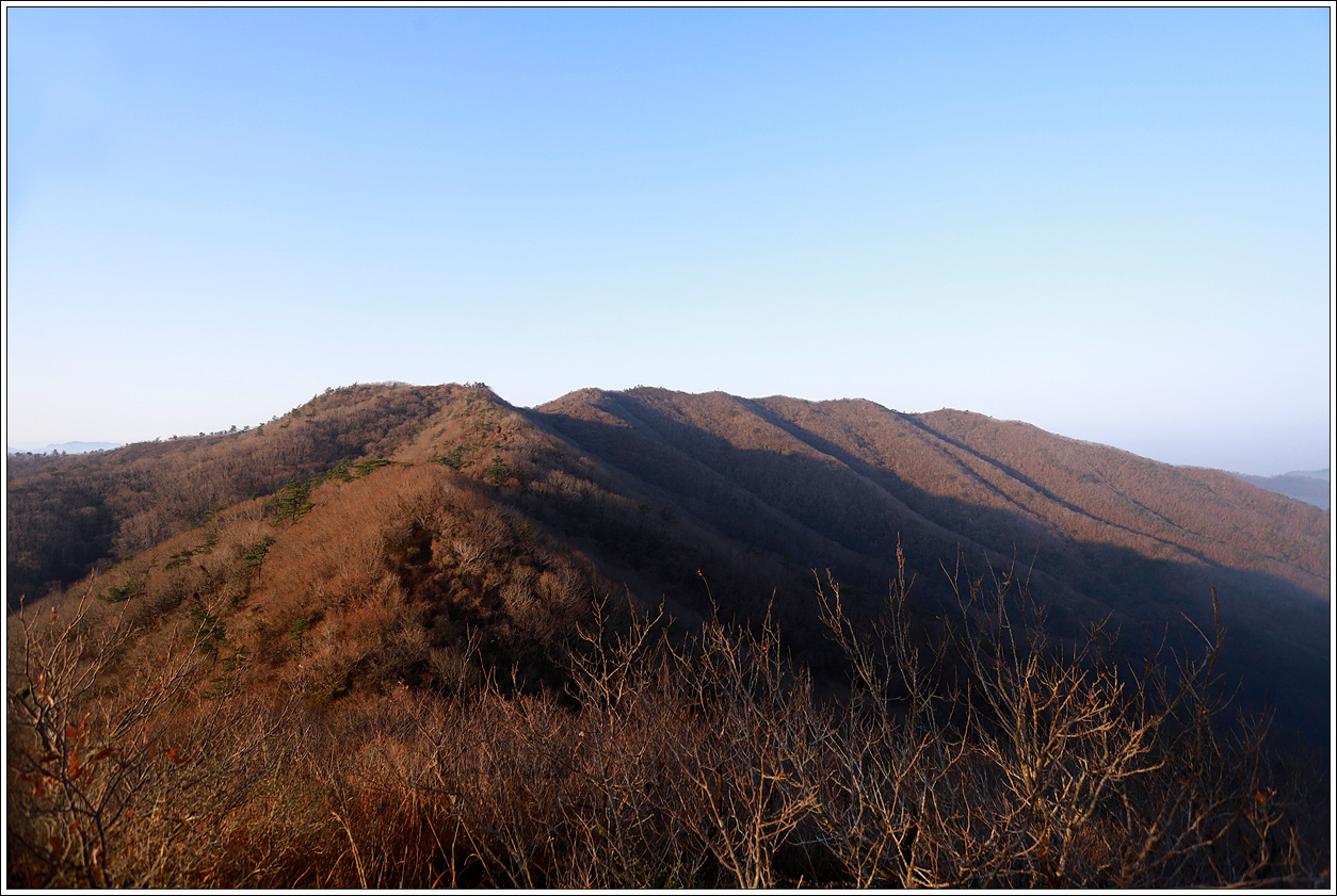 ▼ 조금 전에 삼봉을 지난 바위에서 일출을 보지 않았으면 지금까지 오면서 잡목으로 인해 주변 조망이 되지 않으니 크게 아쉬울 뻔 했는데 어제 저녁까지 내린 비로 촉촉한 흙길을 밟는 촉감이 아주 좋다.