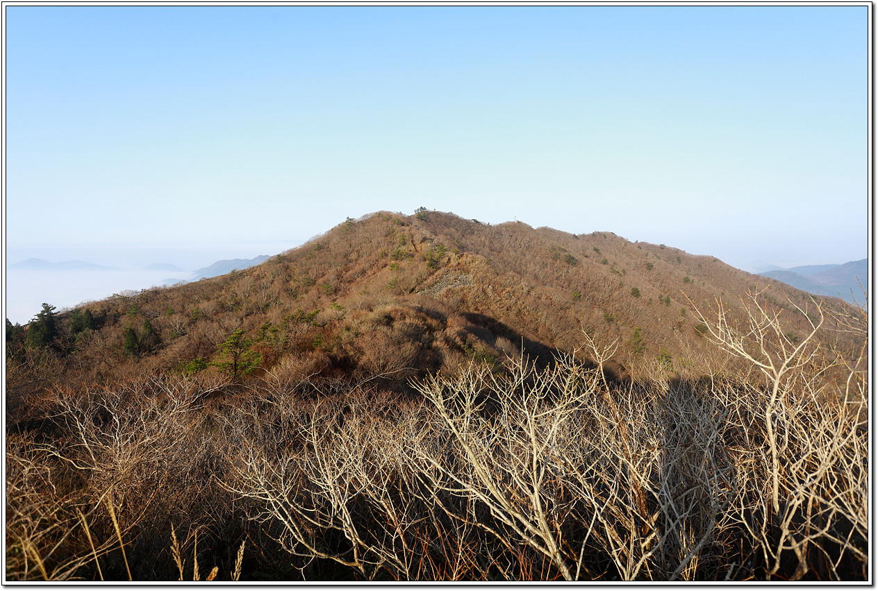 ▼ 들머리에서 오른 지 한 시간이 채 안된 1.7km 거리에 삼봉에서 좀 더 오르면서 날이 밝아 오는데 아직은 어둑어둑한 6시 20분경이니 일출을 보려면 해 뜨는 시각이 6시 47분이라는데 아직도 멀었다. 선두는 벌써 오래전에 앞서 갔고 바로 앞에 펼쳐진 풍경에 발을 뗄 수가 없었다.