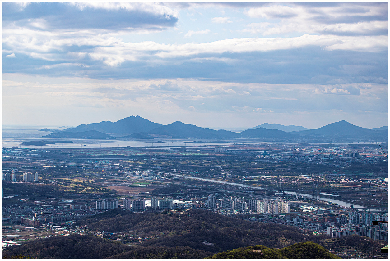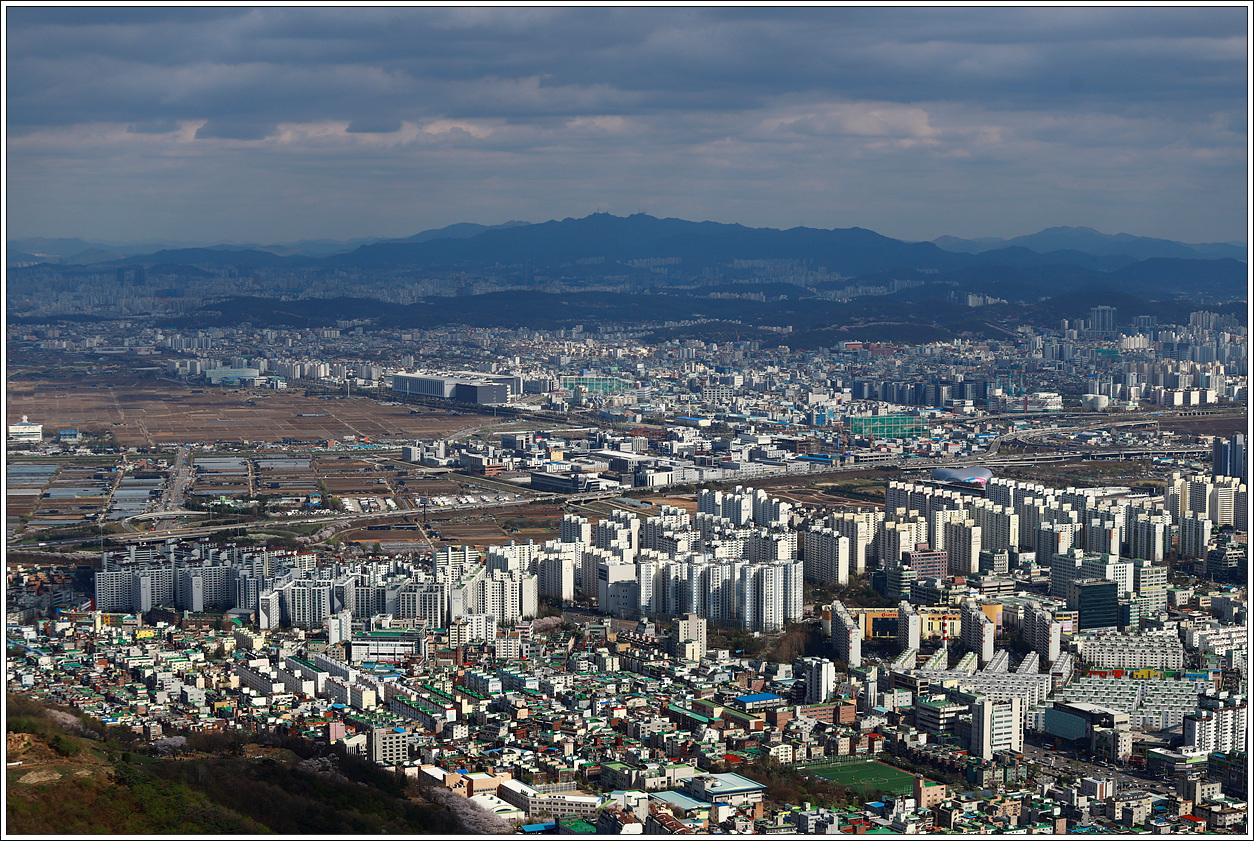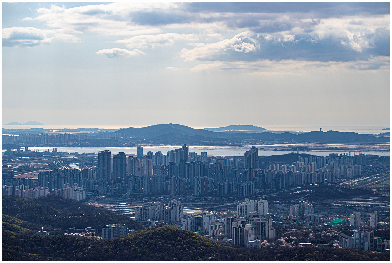 ▼ 남동쪽으로 방향을 틀어 인천 시내를 살펴본다. 앞이 계양구의 계산동, 용종동 멀리 부천시내가 눈에 들어오고 관악산과 삼성산이 배경을 이루고 있다.