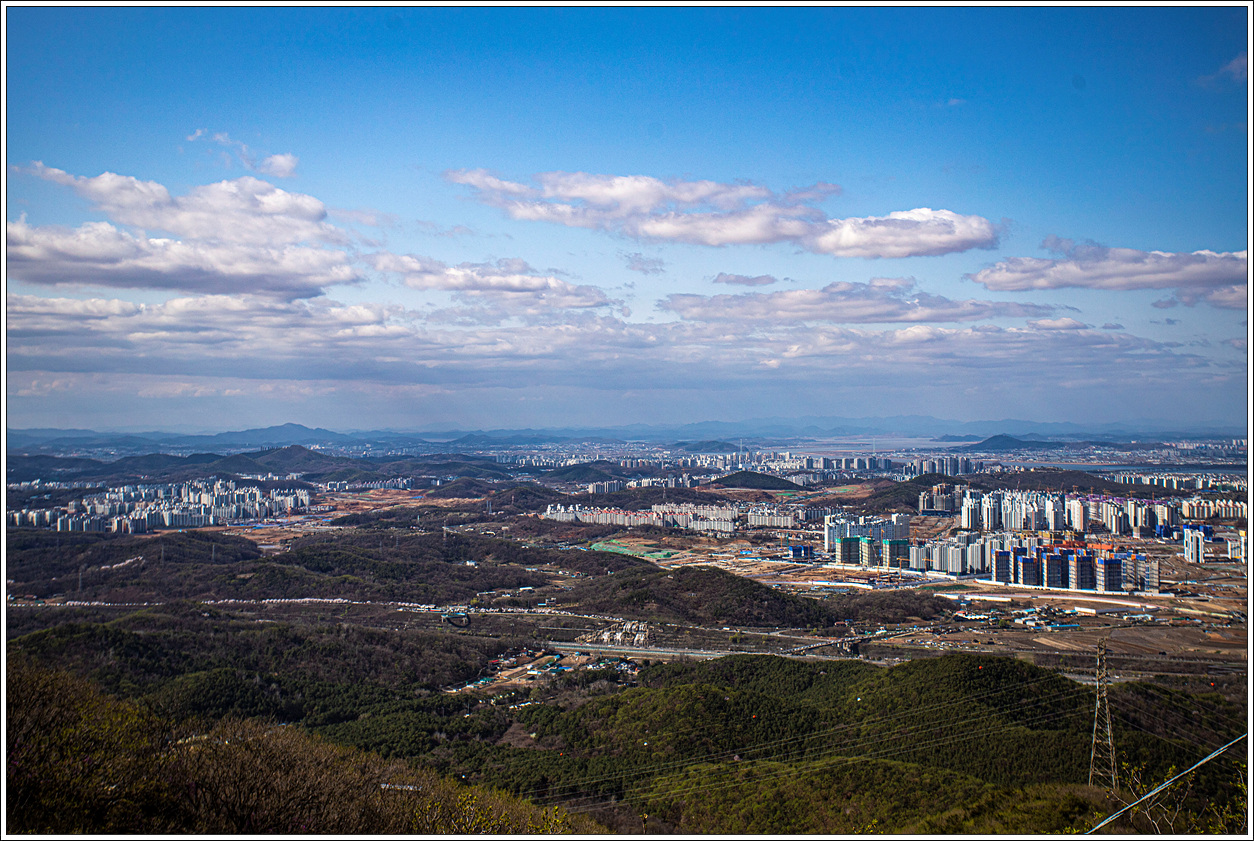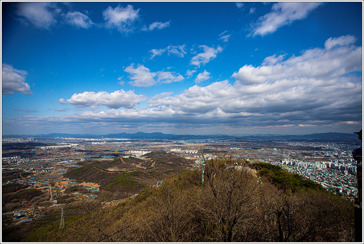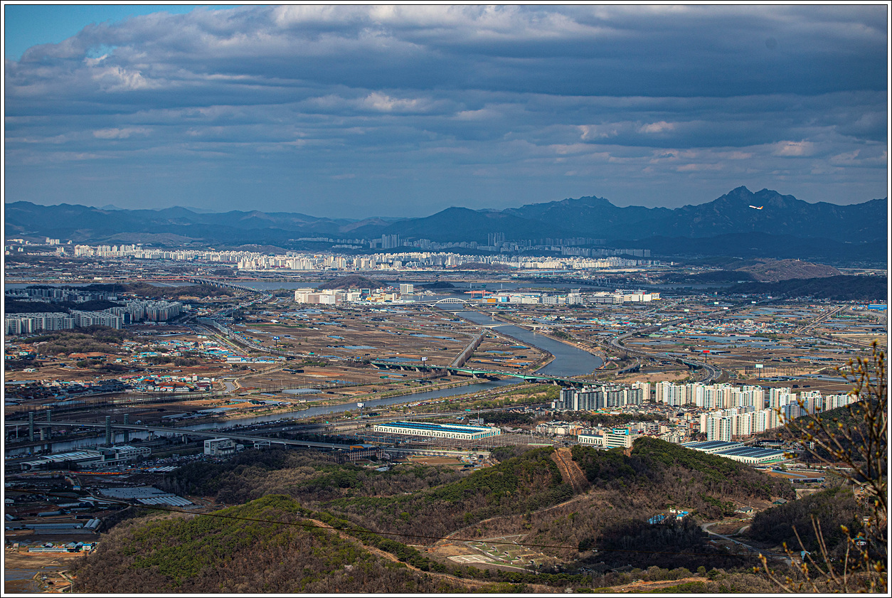 ▼ 남동쪽으로 방향을 틀어 인천 시내를 살펴본다. 앞이 계양구의 계산동, 용종동 멀리 부천시내가 눈에 들어오고 관악산과 삼성산이 배경을 이루고 있다.