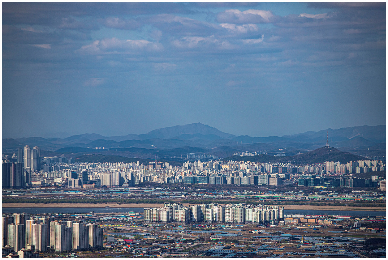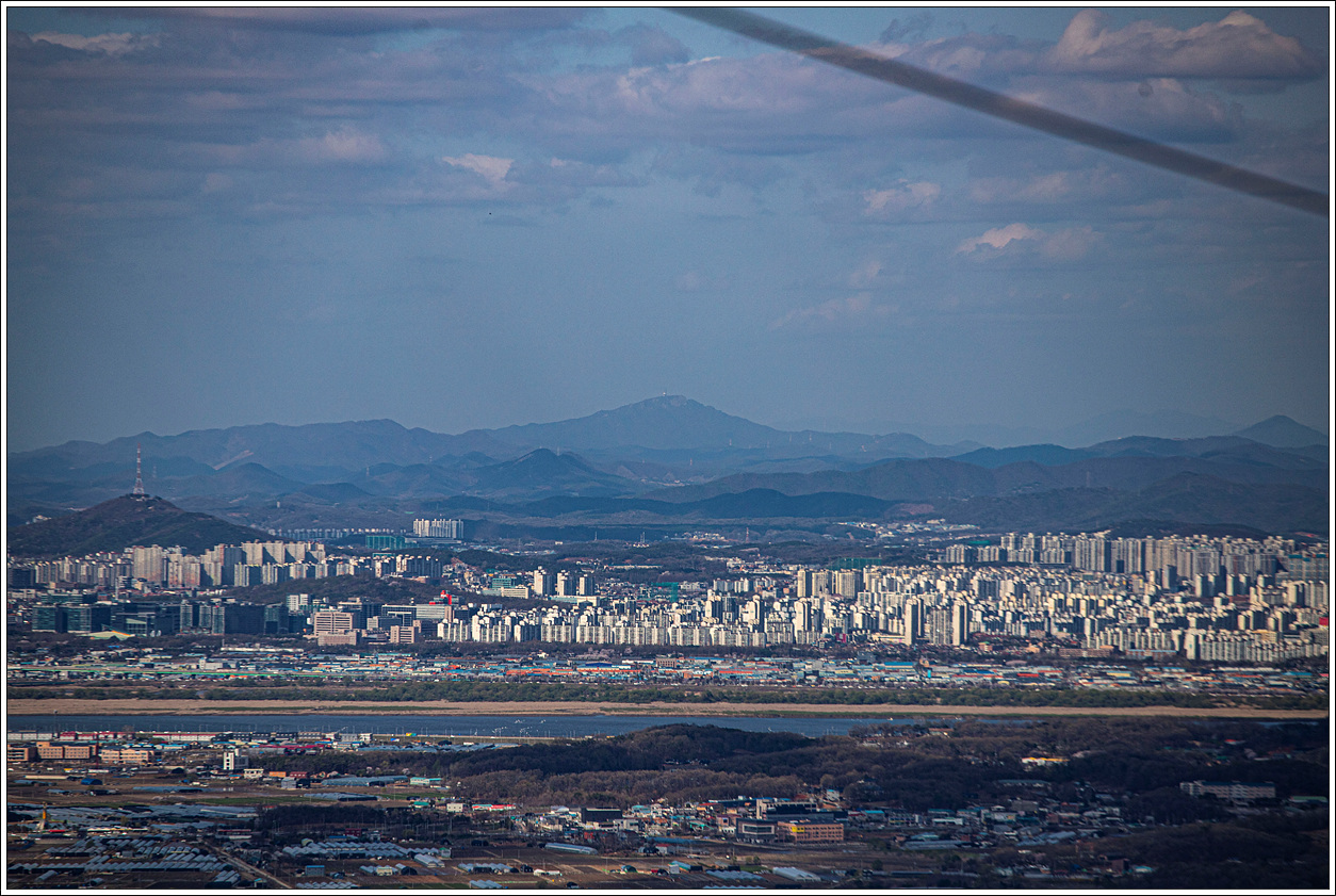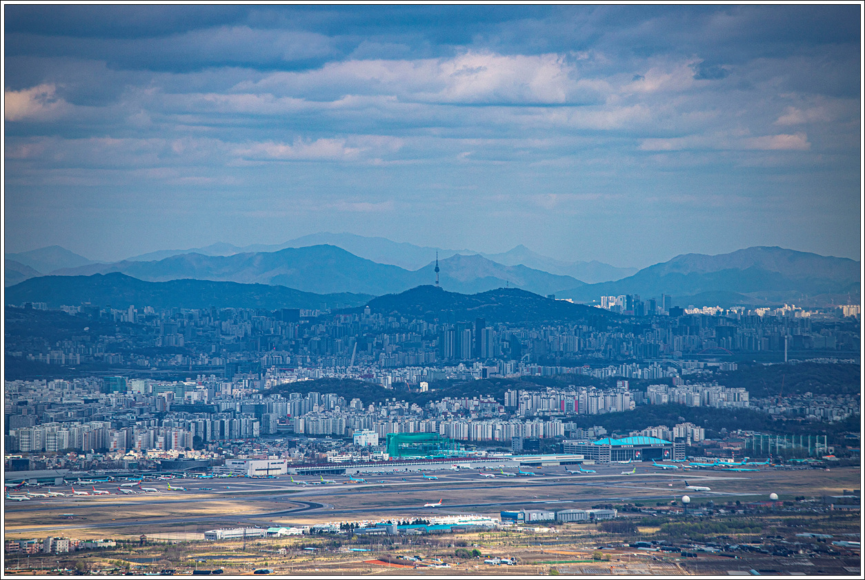 ▼ 왼쪽 앞으로 낙산, 가운데 벚꽃으로 띠를 이룬 남산과 오른쪽 검단산, 멀리는 용문산도 희미하나마 조망되고 바로 앞엔 김포공항 활주로...