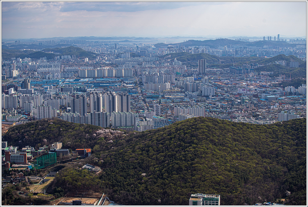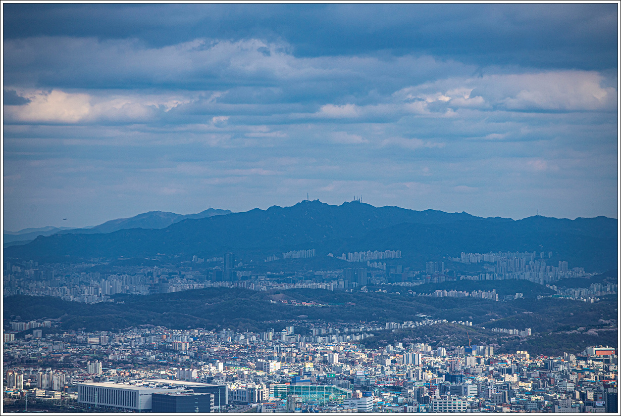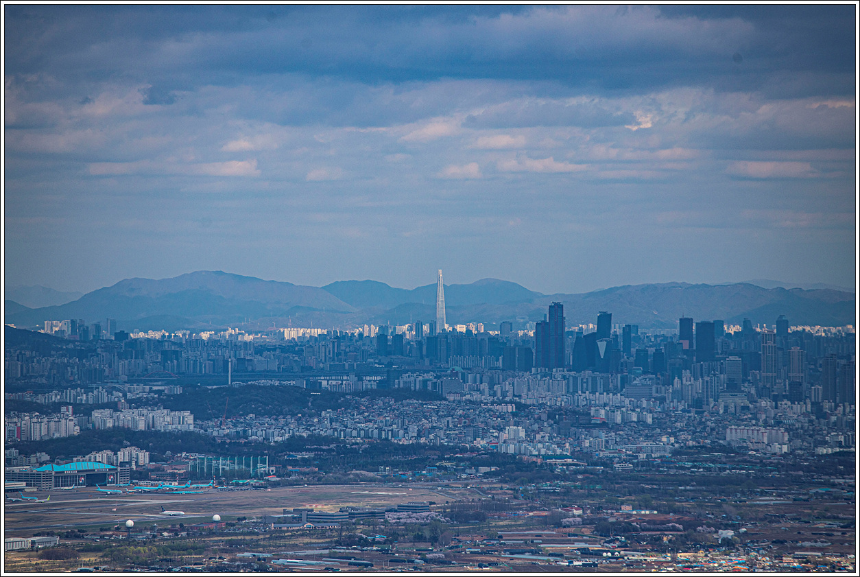 ▼ 왼쪽 앞으로 낙산, 가운데 벚꽃으로 띠를 이룬 남산과 오른쪽 검단산, 멀리는 용문산도 희미하나마 조망되고 바로 앞엔 김포공항 활주로...