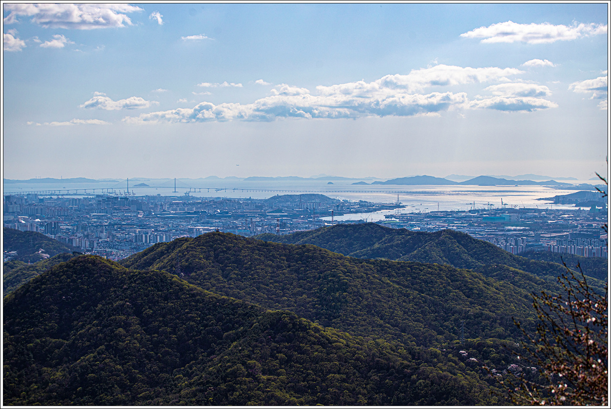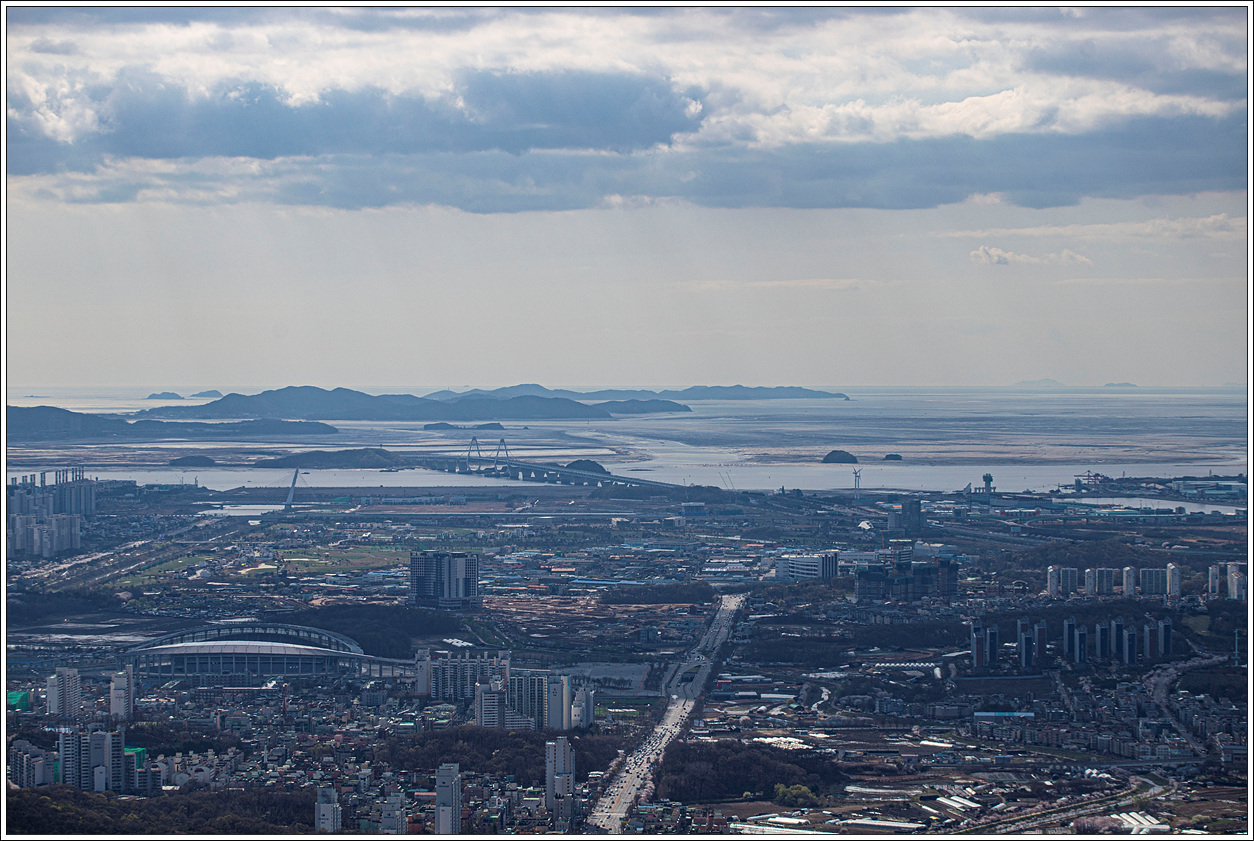▼ 인천대교와 가운데 월미도와 북항이 한눈에 들어오고 왼쪽 멀리 영흥도로 부터 승봉도, 대이작도, 가운데 자월도 오른쪽 무의도 호룡곡산과 그 뒤로 덕적도까지 인천 앞바다의 섬들이 파노라마처럼 이어져 조망된다.