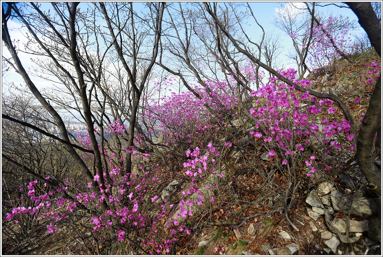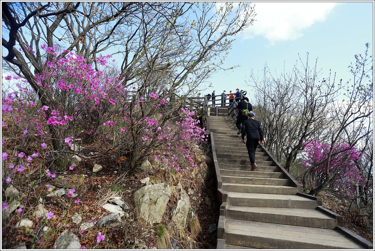 ▼ 진달래가 산 아래쪽은 지고 있는데 정상은 오늘 만개한 상태다. 올 진달래 산행은 주말마다 우천으로 인해 보지 못한 아쉬움이 있는데 이곳에서나마 보게 되어 그나마 다행이다. 앞으로의 철쭉 산행은 예년에 비해 일주일 이상 빨리 개화할 것을 예상하여 계획해야 할 것 같다.