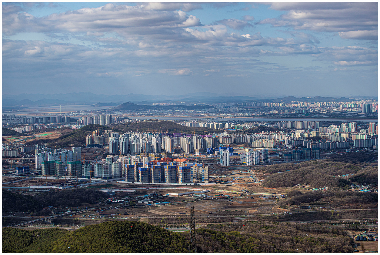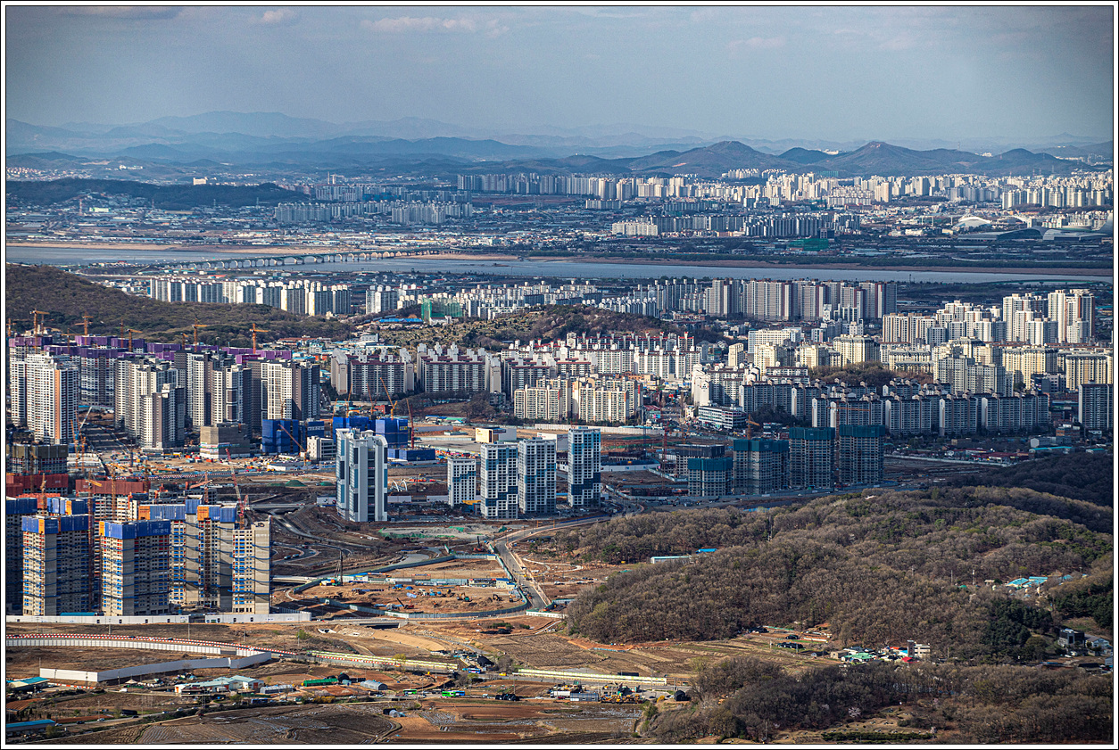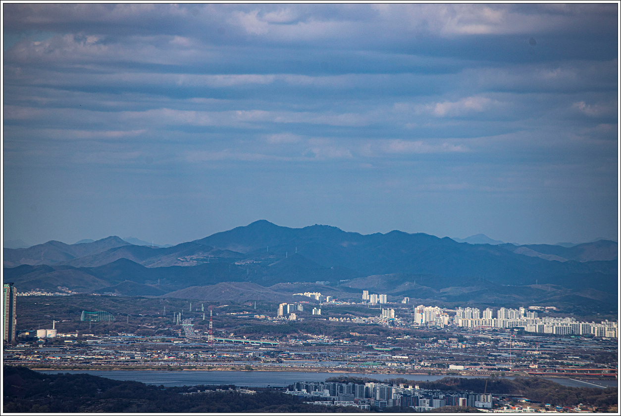 ▼ 좀 더 렌즈를 당겨 본 한창 건설중인 검단신도시와 한강 넘어 파주의 심학산과 그 뒤로 오두산전망대