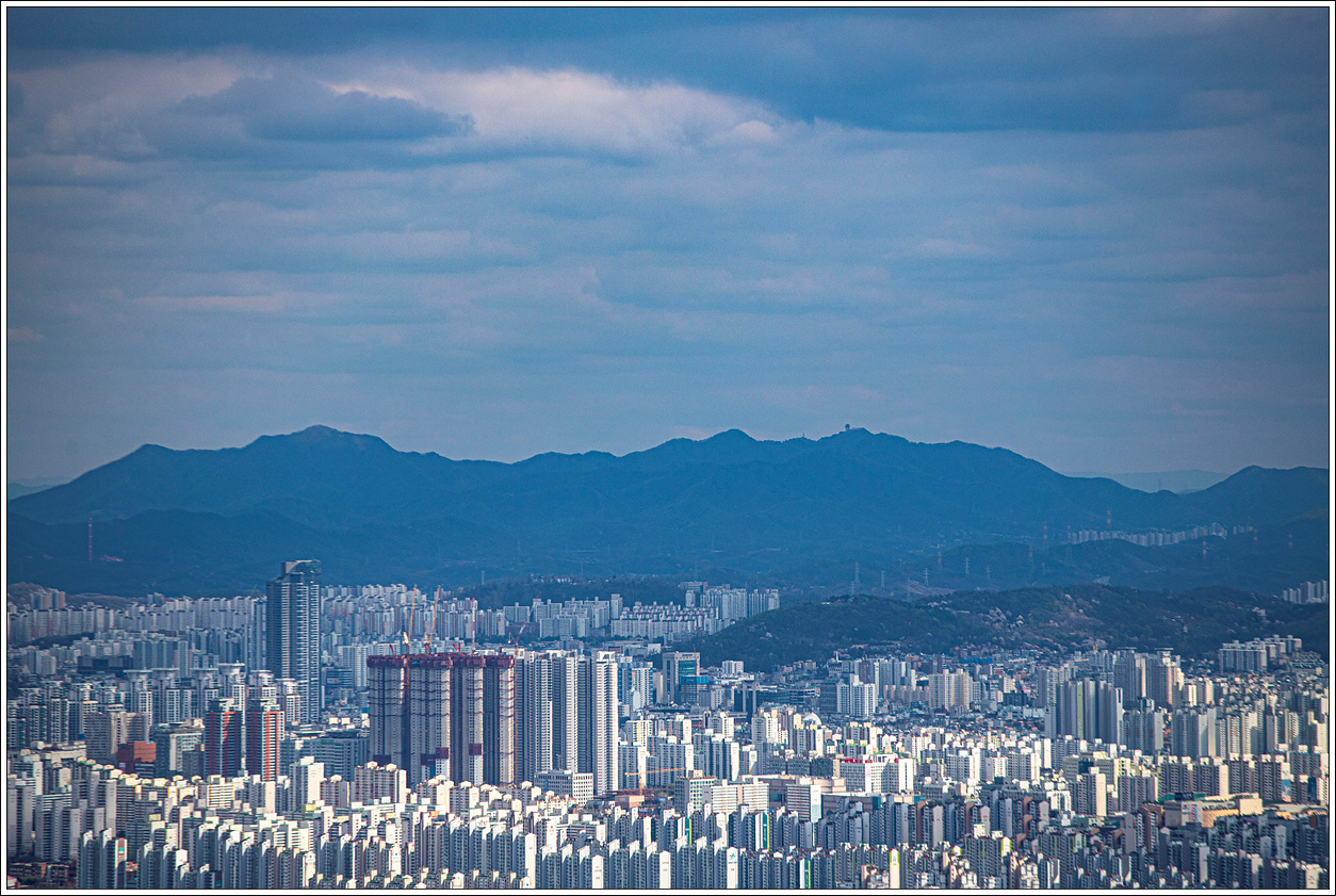 ▼ 고층빌딩과 성냥갑 같은 빽빽한 건물 보다는 멀리 보이는 안양의 수리산이 눈에 들어 올 수밖에 없다. 왼쪽이 수리산의 태을봉, 가운데가 슬기봉, 수암봉은 돔레이더 아랫쪽에 위치해 있어서 잘 보이지 않는다.