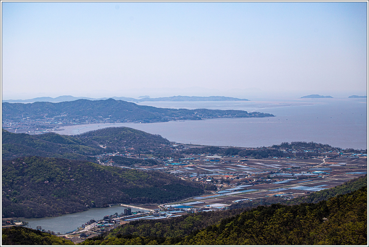 ▼ 바로 앞은 인산저수지, 멀리 마니산 능선이 끝자락에 선수선착장이 보이고 그 뒤로 멀리 장봉도가 길게 자리하고 있다.