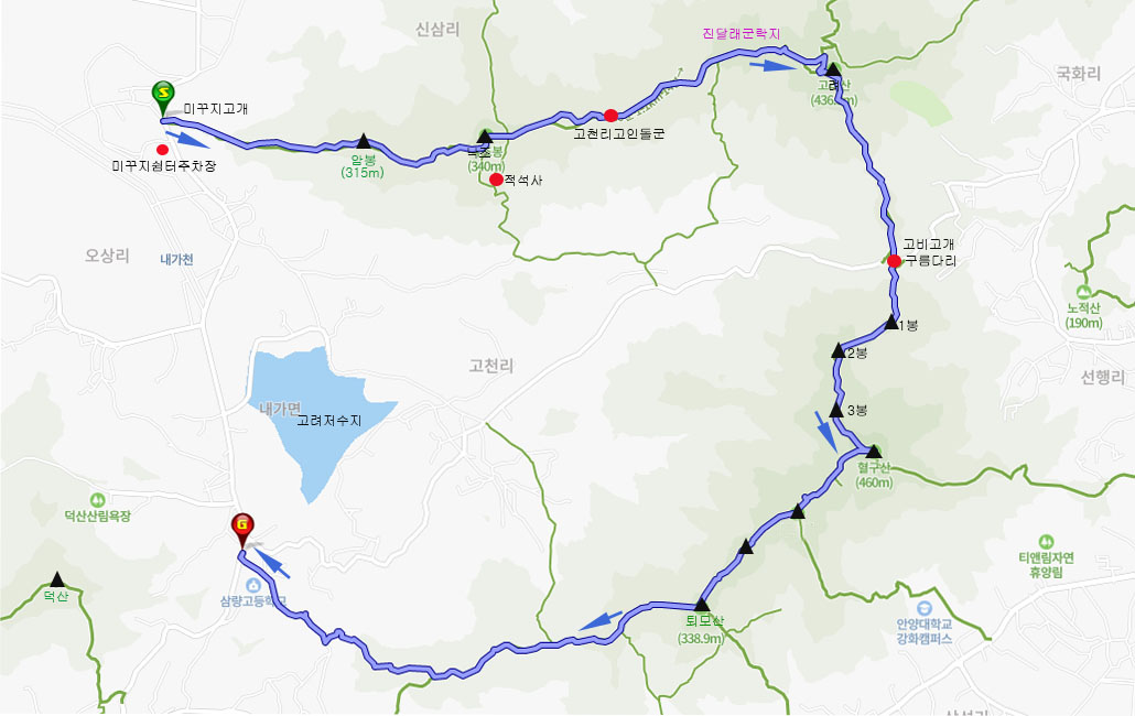 ♣ 산행코스: 미꾸지고개-낙조봉-고려산-고비고개 구름다리-혈구산-퇴모산-삼량중고등학교 버스정류장