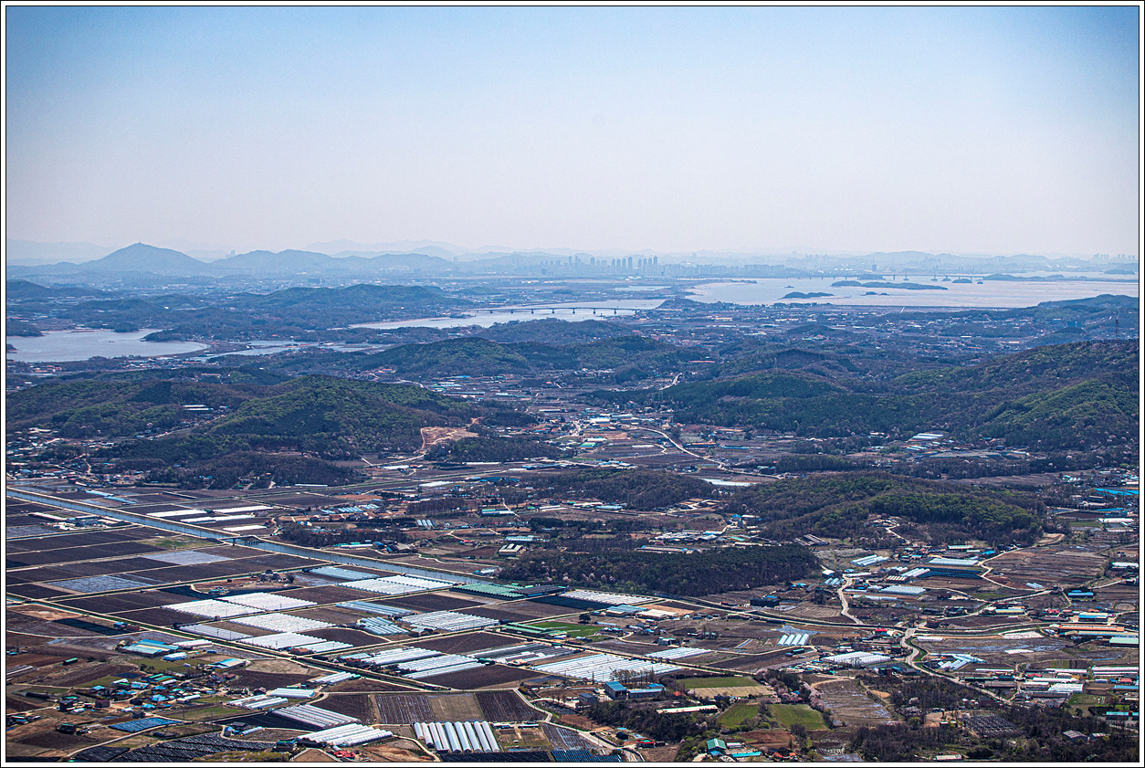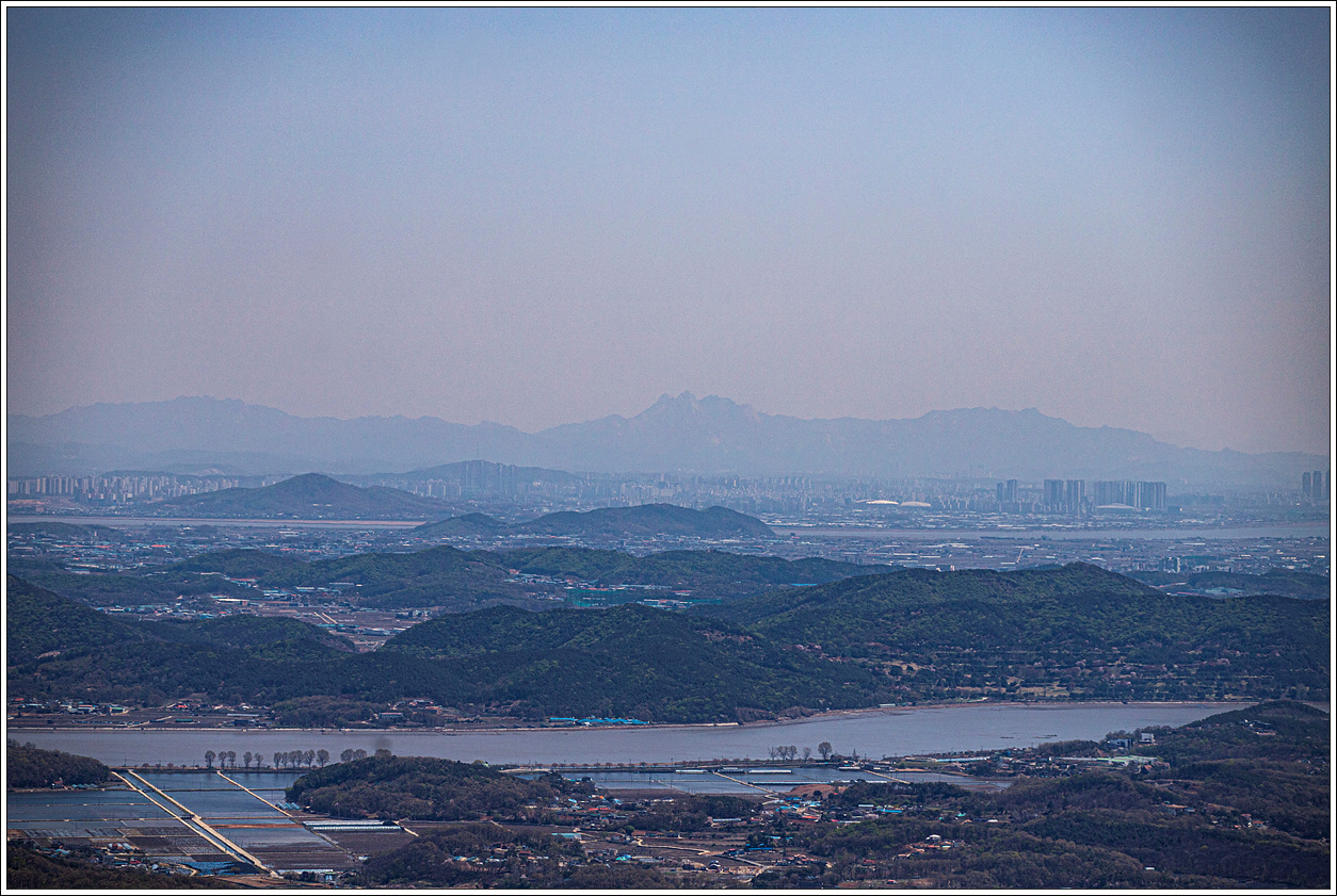 ▼ 왼쪽 멀리 북한산의 백운봉이 뚜렷이 보이고 오른쪽에 김포 가현산 북쪽으로는 김포 신도시가 자리하고 있다.