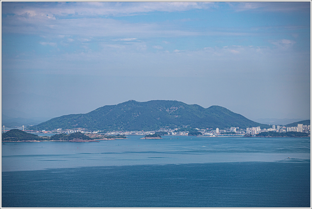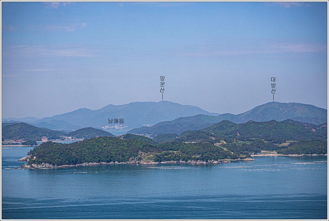 ▼ 남해의 최고봉인 망운산과 남해읍이 조망되고 그 오른쪽으로 창선도의 대방산이 엊그제 갔다 온 듯 반갑게 보인다.