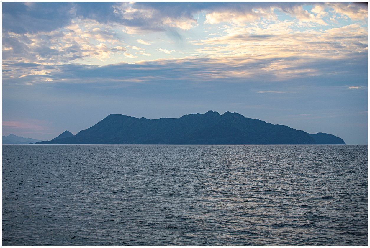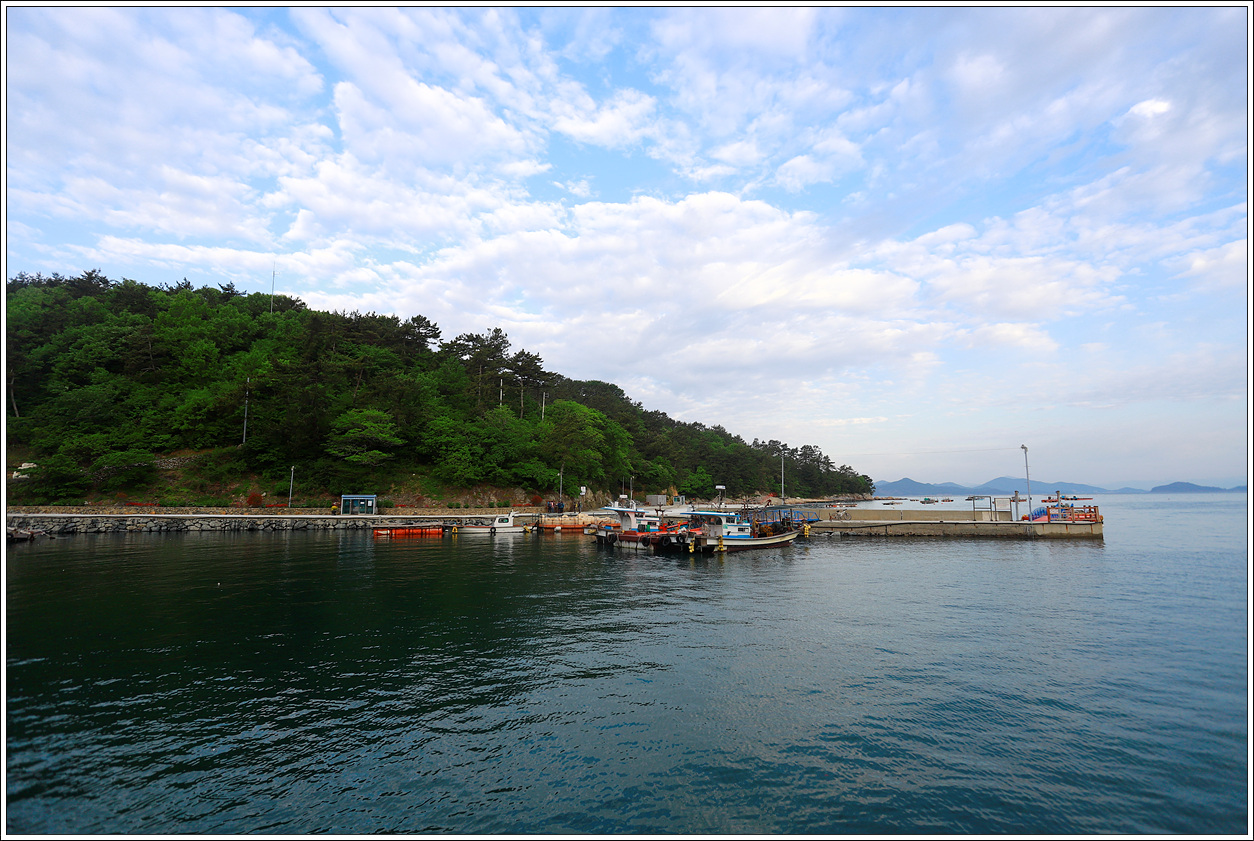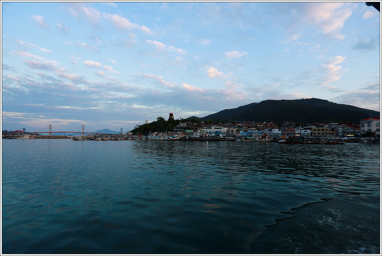 ▼ 바람이 없어 파도도 잔잔하고 구름이 드리운 하늘에 아침 먼동이 튼다. 수우도까지 가는데 40분이 걸린다니 오늘 같은 날은 흔히들 먹는 멀미약은 복용하거나 붙일 필요가 없을 듯 하다.