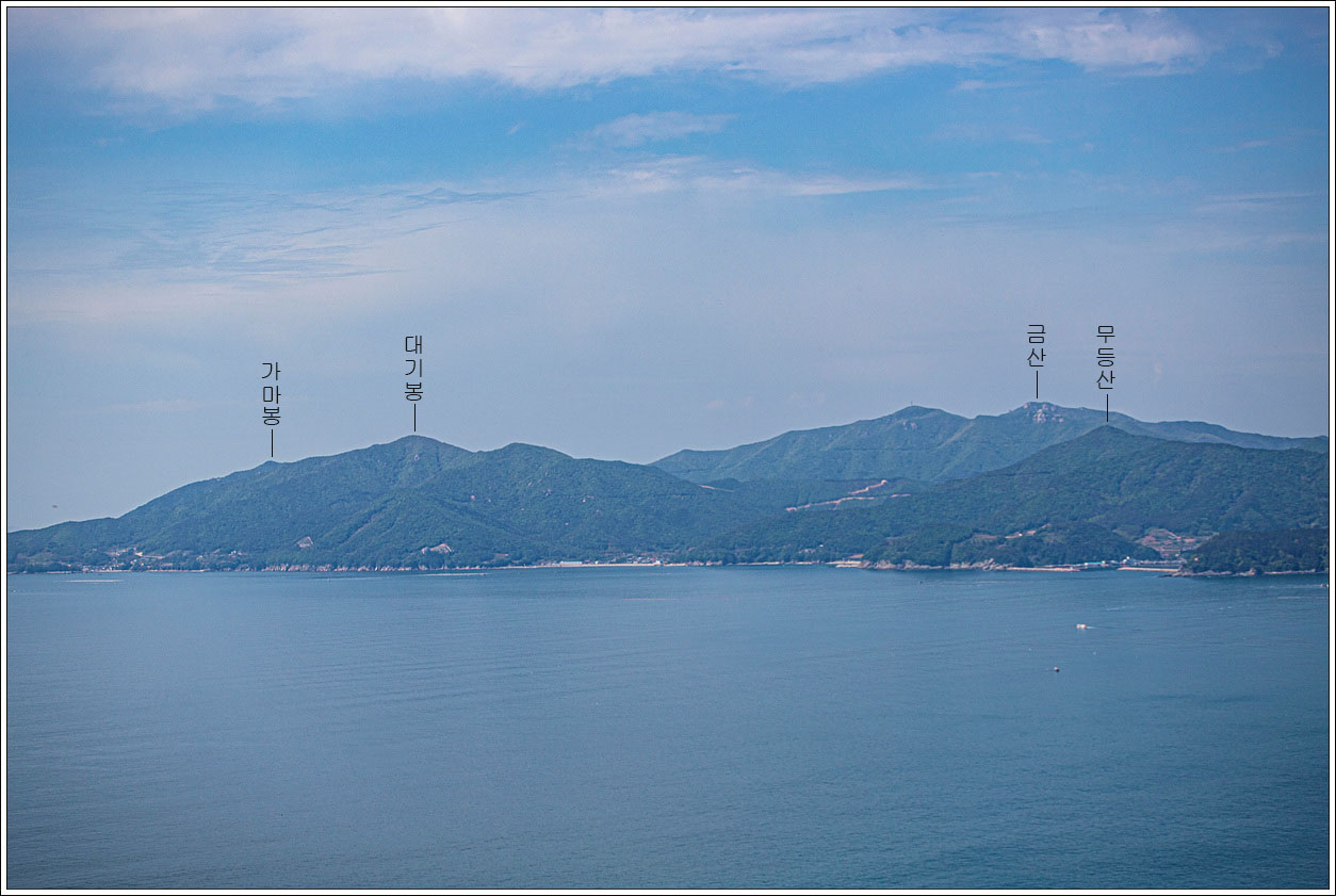 ▼ 왼쪽에 남해군의 대기봉과 가운데 금산, 오른쪽 창선도의 대방산이 눈에 들어온다.